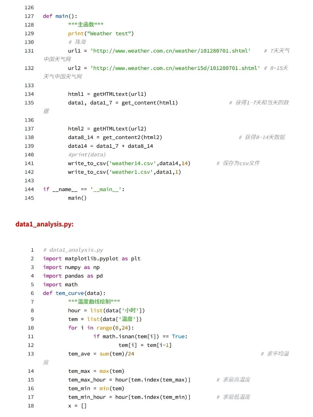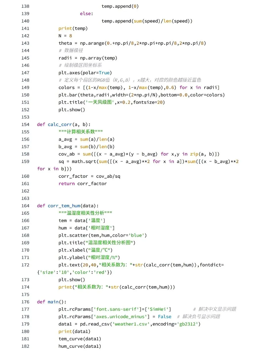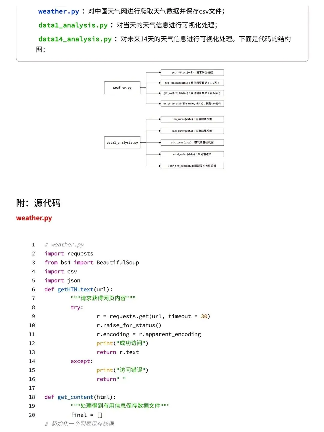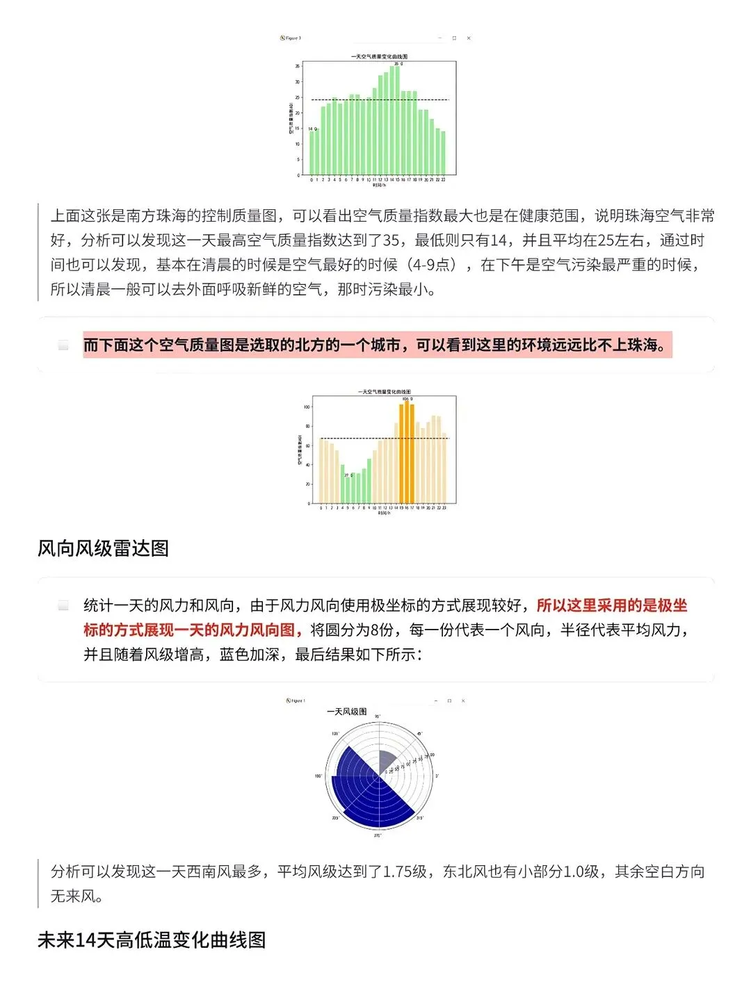 ✅本次使用python中requests和BeautifulSoup库对中国天气网当天和未来14天的数据进行爬取,保存为csv文件,之后用matplotlib、numpy、pandas对数据进行可视化处理和分析,得到温湿度度变化曲线、空气质量图、风向雷达图等结果,为获得未来天气信息提供有效方法。