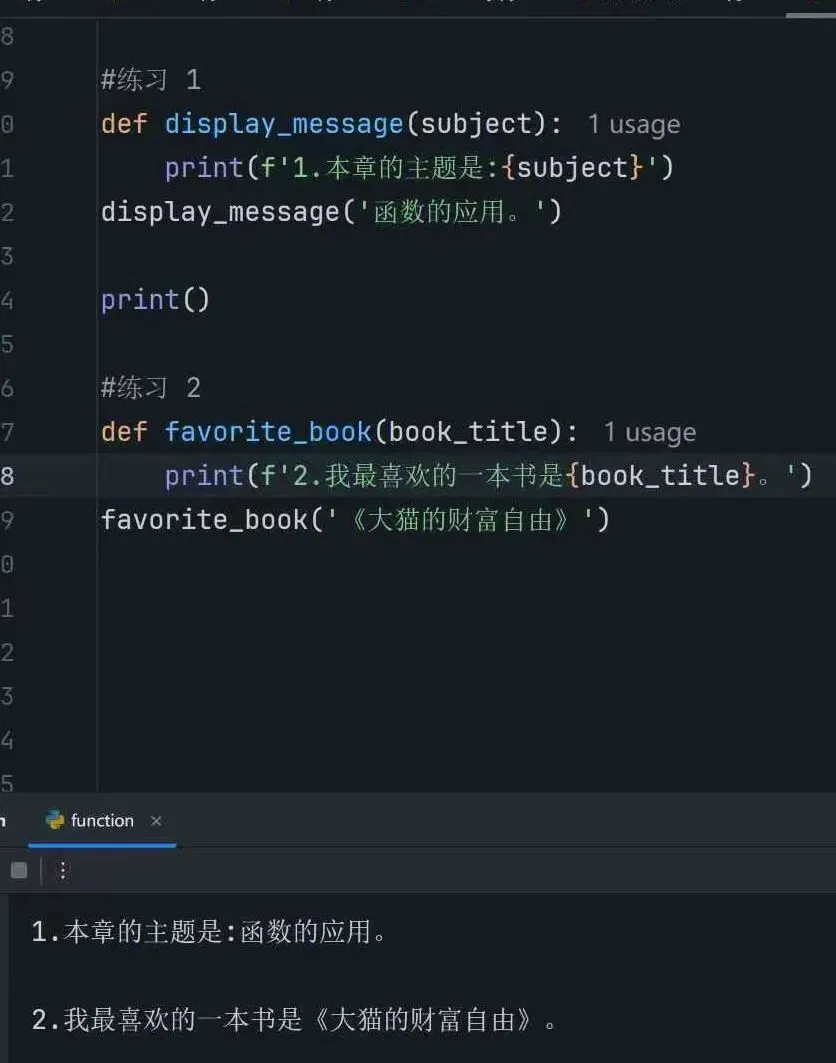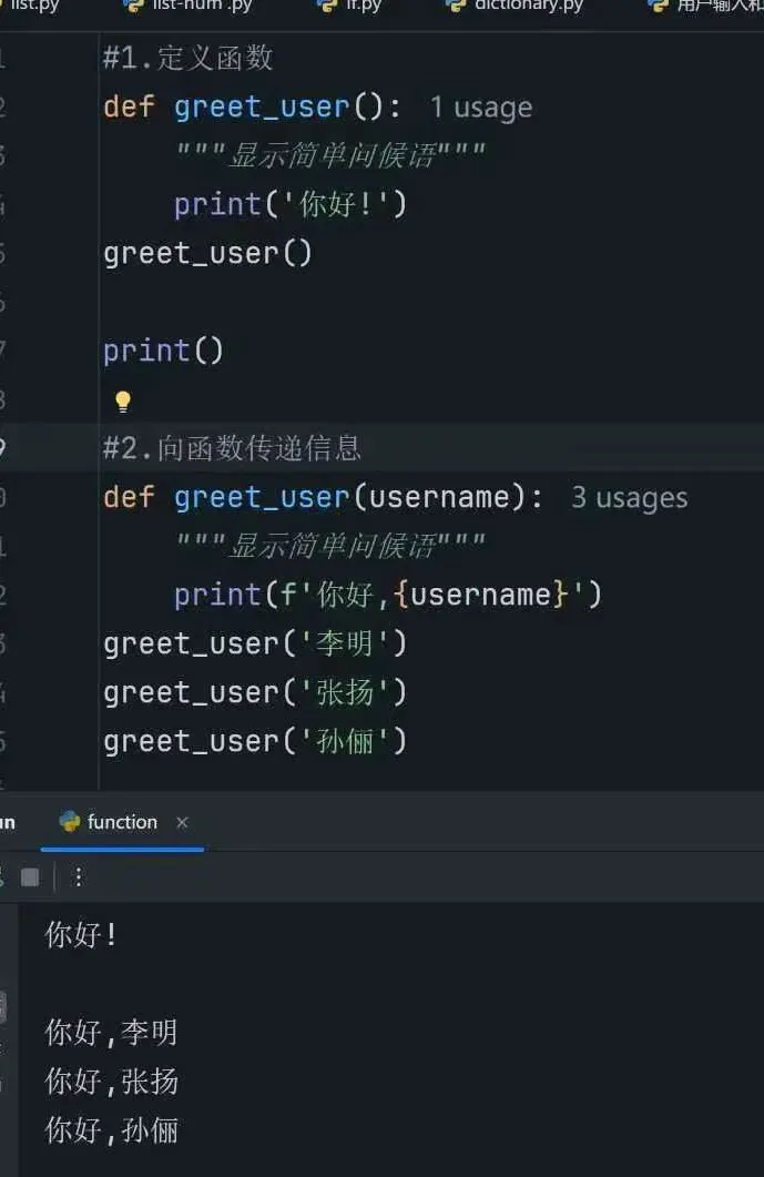 1. 使用关键字def来告诉定义一个函数;然后指出:函数名+(),(如果括号内暂时没有东西,表示不需要额外信息);最后定义以:结尾