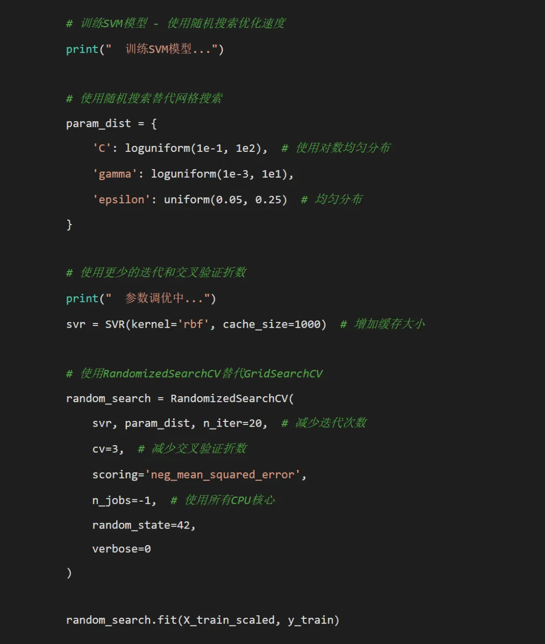 # 使用最佳参数训练最终模型 best_svr = random_search.best_estimator_# 预测 train_pred = best_svr.predict(X_train_scaled) test_pred = best_svr.predict(X_test_scaled)# 计算评估指标 train_rmse = np.sqrt(mean_squared_error(y_train, train_pred)) test_rmse = np.sqrt(mean_squared_error(y_test, test_pred)) train_mae = mean_absolute_error(y_train, train_pred) test_mae = mean_absolute_error(y_test, test_pred) train_r2 = r2_score(y_train, train_pred) test_r2 = r2_score(y_test, test_pred)# 存储结果 disease_results = {'Disease': disease,'Train_Size': len(train_data),'Test_Size': len(test_data),'Train_RMSE': train_rmse,'Test_RMSE': test_rmse,'Train_MAE': train_mae,'Test_MAE': test_mae,'Train_R2': train_r2,'Test_R2': test_r2,'SVM_Cost': random_search.best_params_['C'],'SVM_Gamma': random_search.best_params_['gamma'],'SVM_Epsilon': random_search.best_params_['epsilon'] } results_summary.append(disease_results)# 存储预测结果 test_dates = featured_data.loc[ test_data.index, 'timestamp'] if'timestamp'in featured_data.columns else test_data.index pred_df = pd.DataFrame({'Date': test_dates,'Actual': y_test.values,'Predicted': test_pred,'Disease': disease }) predictions_list[disease] = pred_df# 存储模型 models_list[disease] = {'model': best_svr,'scaler': scaler,'features': X_train.columns.tolist(),'best_params': random_search.best_params_ }# 使用更快的特征重要性计算方法print(" 计算特征重要性...")# 使用更少的树和并行计算 rf_model = RandomForestRegressor( n_estimators=50, # 减少树的数量 random_state=42, n_jobs=-1, # 使用所有CPU核心 max_features='sqrt'# 减少特征考虑数量 ) rf_model.fit(X_train, y_train) importance_df = pd.DataFrame({'Feature': X_train.columns,'Importance': rf_model.feature_importances_ }).sort_values('Importance', ascending=False) feature_importance_list[disease] = importance_df# 并行保存特征重要性数据 importance_df.to_csv(os.path.join(results_path, f'Feature_Importance/{disease}_Feature_Importance.csv'), index=False)# 只生成最重要的可视化图表 try: