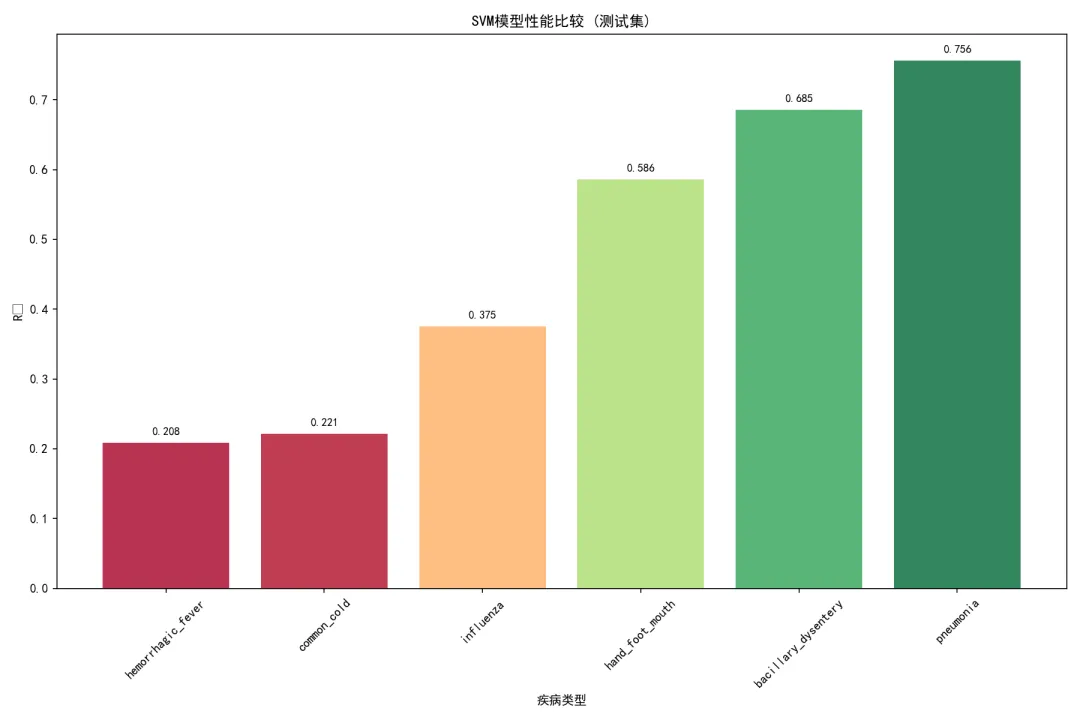 # 2. 特征重要性图 (只显示前10个) plt.figure(figsize=(10, 6)) top_features = importance_df.head(10) # 只显示前10个 plt.barh(top_features['Feature'], top_features['Importance']) plt.title(f'{disease} 特征重要性 (前10)') plt.xlabel('重要性') plt.tight_layout() plt.savefig(os.path.join(results_path, f'Plots/{disease}_Feature_Importance.png'), dpi=150) plt.close() except Exception as e:print(f" 可视化图表生成失败: {e}")print(f" {disease} 建模完成")# 保存总体结果if results_summary: results_df = pd.DataFrame(results_summary) results_df.to_csv(os.path.join(results_path, "Model_Performance_Summary.csv"), index=False)# 保存预测结果 all_predictions = pd.concat(predictions_list.values(), ignore_index=True) all_predictions.to_csv(os.path.join(results_path, "Predictions/All_Disease_Predictions.csv"), index=False)# 只生成关键的可视化图表# 模型性能比较图 plt.figure(figsize=(12, 8)) results_sorted = results_df.sort_values('Test_R2') colors = plt.cm.RdYlGn((results_sorted['Test_R2'] - results_sorted['Test_R2'].min()) / (results_sorted['Test_R2'].max() - results_sorted['Test_R2'].min())) bars = plt.bar(range(len(results_sorted)), results_sorted['Test_R2'], color=colors, alpha=0.8) plt.title('SVM模型性能比较 (测试集)') plt.xlabel('疾病类型') plt.ylabel('R²') plt.xticks(range(len(results_sorted)), results_sorted['Disease'], rotation=45)# 添加数值标签for i, bar in enumerate(bars): height = bar.get_height() plt.text(bar.get_x() + bar.get_width() / 2., height + 0.01, f'{height:.3f}', # 只显示R²值 ha='center', va='bottom', fontsize=9) plt.tight_layout() plt.savefig(os.path.join(results_path, "Plots/Model_Performance_Comparison.png"), dpi=150) plt.close()# 批量保存模型for disease, model_info in models_list.items(): joblib.dump(model_info, os.path.join(results_path, f'Models/{disease}_svm_model.pkl'))# 生成最终报告print("\n=== SVM建模完成 ===")print(f"建模疾病数量: {len(models_list)}")print("训练集时间范围: 1981-2015")print("测试集时间范围: 2016-2025")print(f"总特征数量: {len(base_features) + len(available_diseases) * 2}\n") # 更新特征数量if results_summary: results_df = pd.DataFrame(results_summary)print("模型性能总结:")print(results_df.to_string(index=False)) best_model = results_df.loc[results_df['Test_R2'].idxmax()] worst_model = results_df.loc[results_df['Test_R2'].idxmin()]print(f"\n最佳性能模型:")print(f"疾病: {best_model['Disease']}, 测试集R²: {best_model['Test_R2']:.3f}, " f"RMSE: {best_model['Test_RMSE']:.1f}")print(f"\n最差性能模型:")print(f"疾病: {worst_model['Disease']}, 测试集R²: {worst_model['Test_R2']:.3f}, " f"RMSE: {worst_model['Test_RMSE']:.1f}")# 计算平均性能 avg_r2 = results_df['Test_R2'].mean() avg_rmse = results_df['Test_RMSE'].mean()print(f"\n平均性能:")print(f"平均测试集R²: {avg_r2:.3f}")print(f"平均测试集RMSE: {avg_rmse:.1f}")print("\n文件输出:")print(f"1. {results_path}/Model_Performance_Summary.csv - 模型性能汇总")print(f"2. {results_path}/Predictions/All_Disease_Predictions.csv - 所有预测结果")print(f"3. {results_path}/Models/ - 所有训练好的SVM模型")print(f"4. {results_path}/Plots/ - 各种可视化图表")print(f"5. {results_path}/Feature_Importance/ - 特征重要性数据")print(f"\n结果文件夹位置: {results_path}")# 公共卫生意义分析print("\n=== 公共卫生意义分析 ===")print("基于特征工程的SVM模型在疾病预测中的优势:")print("1. 多源数据整合: 能够整合气象数据、时间特征和疾病历史数据")print("2. 非线性关系建模: SVM能够捕捉疾病与影响因素之间的复杂非线性关系")print("3. 泛化能力强: 通过核技巧在高维特征空间中寻找最优分离超平面")print("\n关键发现:")for disease in available_diseases:if disease in feature_importance_list: top_features = feature_importance_list[disease]['Feature'].head(3).tolist()print(f"- {disease}: 最重要的特征包括 {', '.join(top_features)}")if __name__ == "__main__": main()