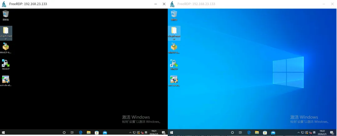 使用/w:1024 /h:768限制分辨率,会让服务器传到客户端的图像更小,分辨率越小传输越快。使用/bpp:16指定传输的图像为16位真彩色,性能肯定优于/bpp:32。很多人会问,用/bpp:8会不会更快。答案是不一定。因为很多Windows服务端最低就是16位真彩,比较老的windows才有可能支持/bpp:8。使用-wallpaper禁止桌面图片传输,这会让桌面变成黑色,视觉效果肯定差,但是传输的内容肯定小了很多,速度也会快不少。如下图所示,做了对比,大家一看便知。DESK vs Remmina
