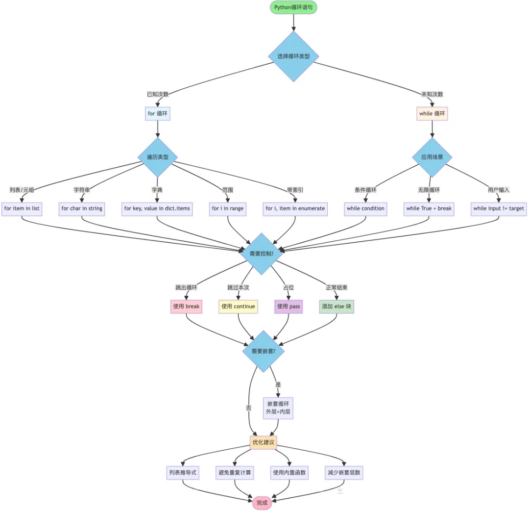 # 技巧 1:使用列表推导式(更快)# 传统方式squares = []for i in range(10): squares.append(i ** 2)# 列表推导式squares = [i ** 2 for i in range(10)]# 技巧 2:避免在循环中重复计算# 不好的做法for i in range(len(my_list)): # len(my_list) 会被重复计算# 好的做法length = len(my_list)for i in range(length): pass# 技巧 3:使用 enumerate 代替 range(len())# 不好的做法for i in range(len(fruits)): print(i, fruits[i])# 好的做法for i, fruit in enumerate(fruits): print(i, fruit)# 技巧 4:使用 zip 同时遍历多个列表names = ["张三", "李四", "王五"]scores = [85, 90, 78]for name, score in zip(names, scores): print(f"{name}: {score}分")