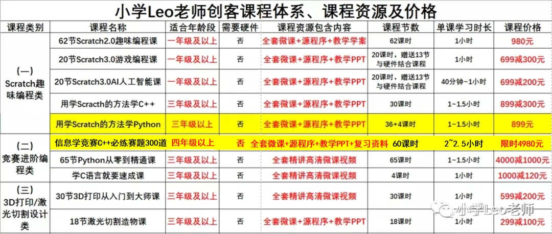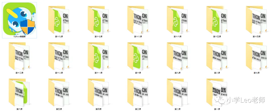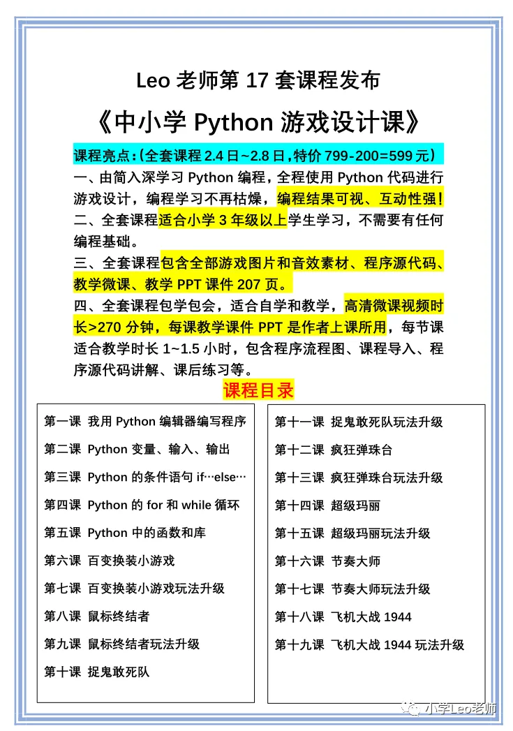 新春课程发布:Leo老师第17套编程课《中小学Python游戏设计》,课程是按照Leo老师上课使用的教学PPT进行再次设计,全套课程包含270分钟教学微课,207页教学精讲PPT(教学流程图、教学导入、编程讲解、课后练习),程序源代码,程序全部图片和音效素材!仅限三天特价599元!