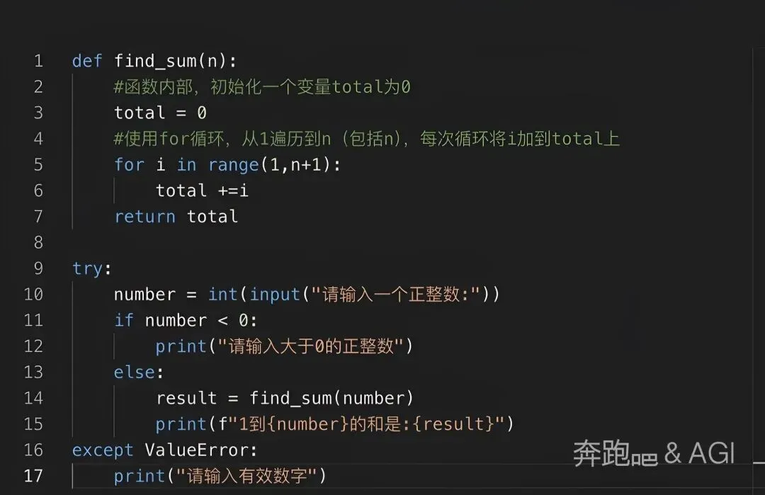 变量和赋值:在函数内部初始化一个变量total,并不断更新其值。