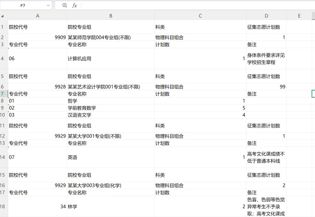 在处理招生计划、财务报表或库存清单时,我们经常会遇到一种“令人头疼”的 Excel 格式:院校信息(父层级)占据一行,其下紧跟着数个专业信息(子层级)。比如这样: