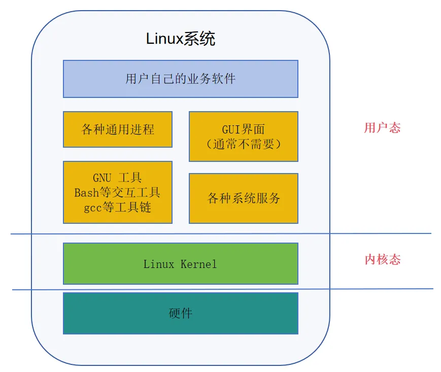 所以大体的一个Linux系统是下图这样,最下面是硬件,包括处理器和各种外围设备,硬件上面是Linux内核和内核态的各种驱动和内核模块,再上面就是各种各样的进程,呈现各种不同的用户界面,但是都是在用户态运行。
