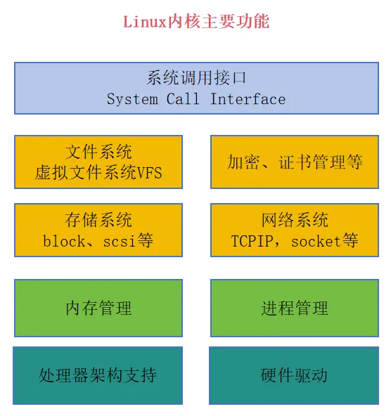 从下图也可以更清楚地看到Linux宏内核的特征,绿色的进程管理和内存管理应该是一个操作系统内核的核心,黄色的这些模块(如文件系统、网络协议栈等)在微内核架构中通常作为用户态服务实现,而 Linux 作为宏内核,将它们全部集成在内核态,因此被称为宏内核。