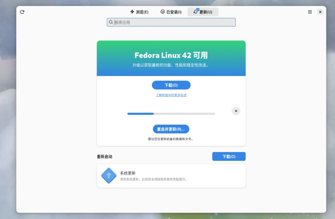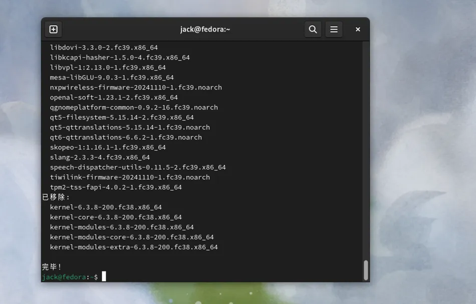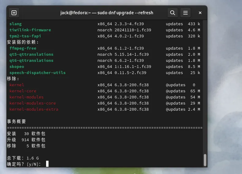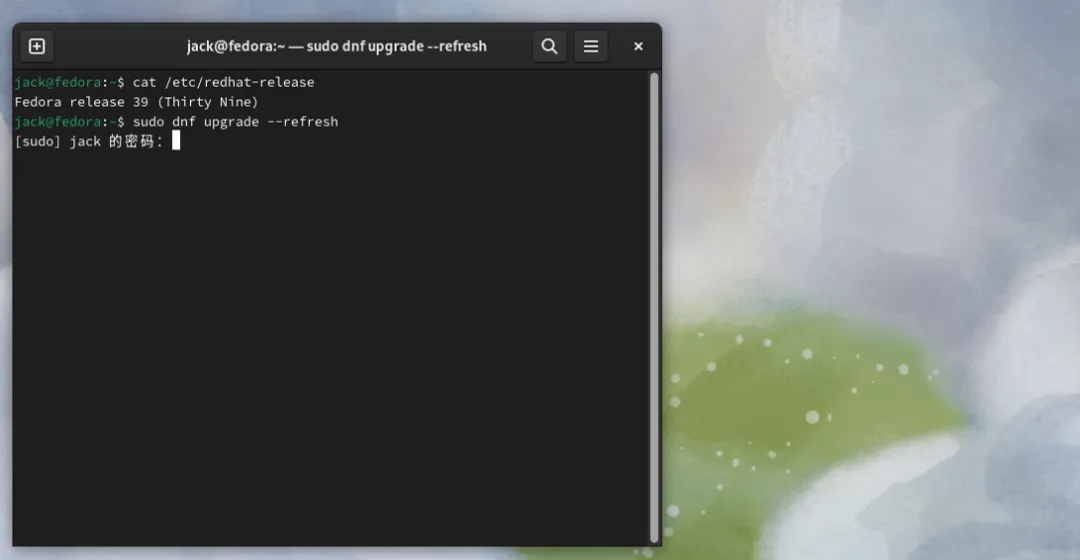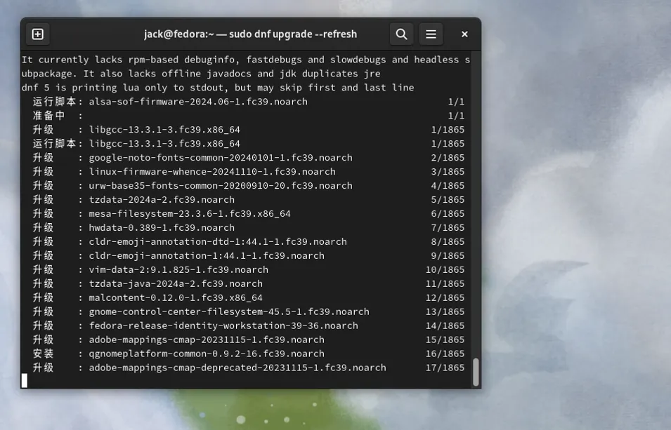 偶然的机会,在虚拟机里发现了,一个很久没有更新的Fedora Linux虚拟电脑。尝试开机启动,还能正常启动,版本是39。这个虚拟机电脑的Fedora Linux安装了很长时间,印象里大概是版本是35的时候,安装的。当时选择Fedora Linux是看重其创新性和GNOME简洁的桌面。后来这个Fedora Linux的虚拟电脑,就一直陆陆续续的升级更新了几个版本,一直升级到39,现在正好有时间打算继续升级一下这个系统。Fedora Linux最新的版到了43,那目标就是43。有前几次升级的经验,知道Fedora Linux的升级其实很简单。最主要的问题是时间久了以后,软件源是否还能用,毕竟Fedora Linux的39版本,距今已经2年多了。这个过程什么都不需要准备,全程由Fedora Linux的dnf软件管理器去完成。因为不是很重要,所以没有做备份,但是注意如果你的电脑里有重要文件资料务必备份!首先启动终端试了一下,把系统所有的软件包先升级到最新版。sudo dnf upgrade --refresh