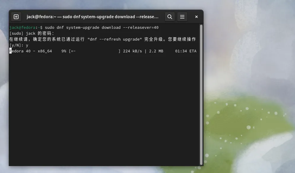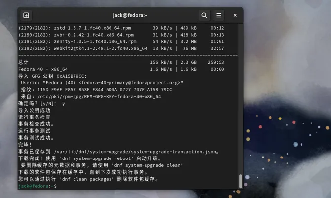 待到这个任务执行完成后,就是40版本的系统软件包都已经下载好了,可以执行重启安装命令。sudo dnf system-upgrade reboot