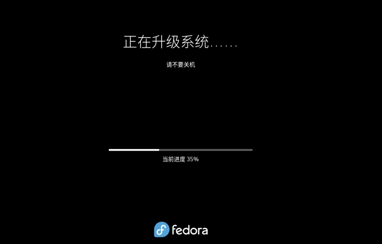 系统重启后,全程不需要操作键盘和鼠标,只需要等待就可以了。虚拟机配置不行,升级速度很慢。升级进度达到100%后,会自动进入到系统的登录界面。至此Fedora Linux就从39升级到40版本。算是完成了一次丝滑升级,没有发生依赖冲突,当然没有重度使用不知道有没有软件插件失效的情况。作为版本强迫症,能激进更新,Fedora Linux工作站的版本确实不错。这次升级只升级了一个版本,其实Fedora Linux已经支持了跨版本升级。接下来试试跳过41直接升42。
