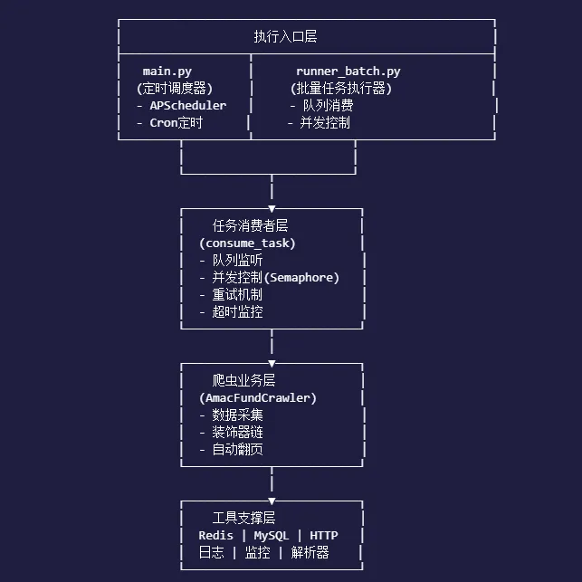 **任务配置**(runner_batch.py:176-182):TASKS = [ { "key": "amacfund:fund_detail", "func": amac_fund_crawler.get_fund_detail, "log": "基金详情", "field": "fund_id", "workers": 20, # 20个并发协程 "limit": 20, # 信号量限制 "need_paging": False }]