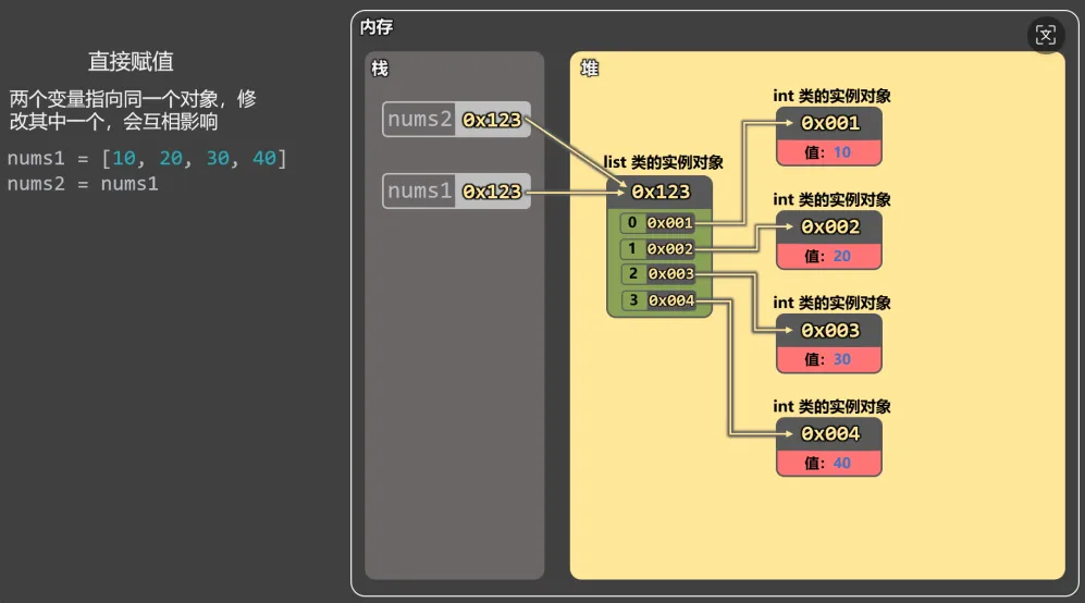 # 直接赋值:两个变量指向同一个对象,修改其中一个,就会影响另一个(互相影响)。