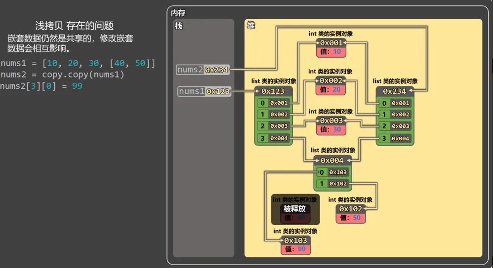 # 浅拷贝存在的问题:嵌套数据仍然是共享的,修改嵌套数据会互相影响