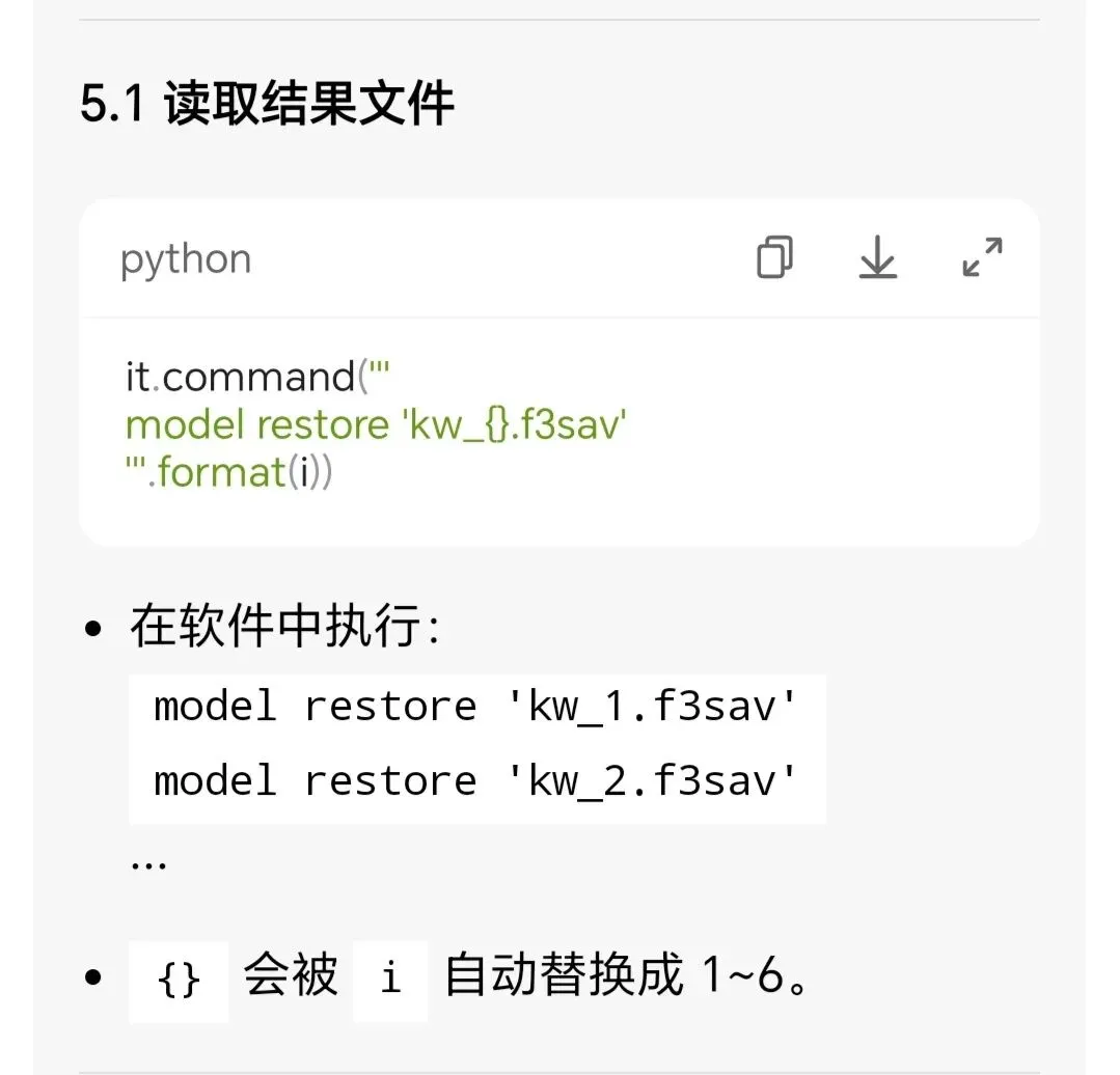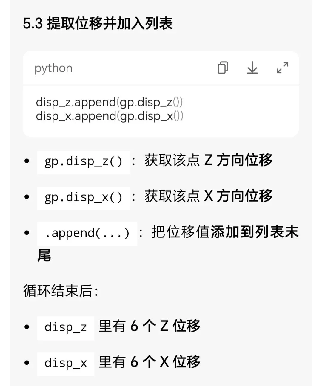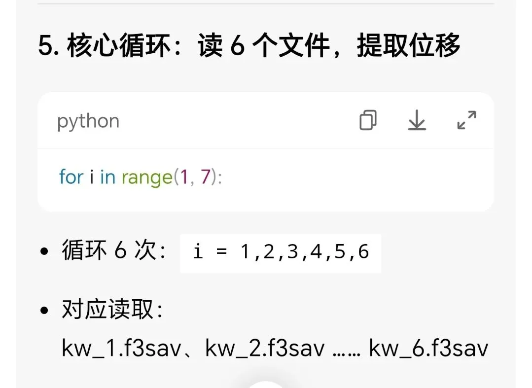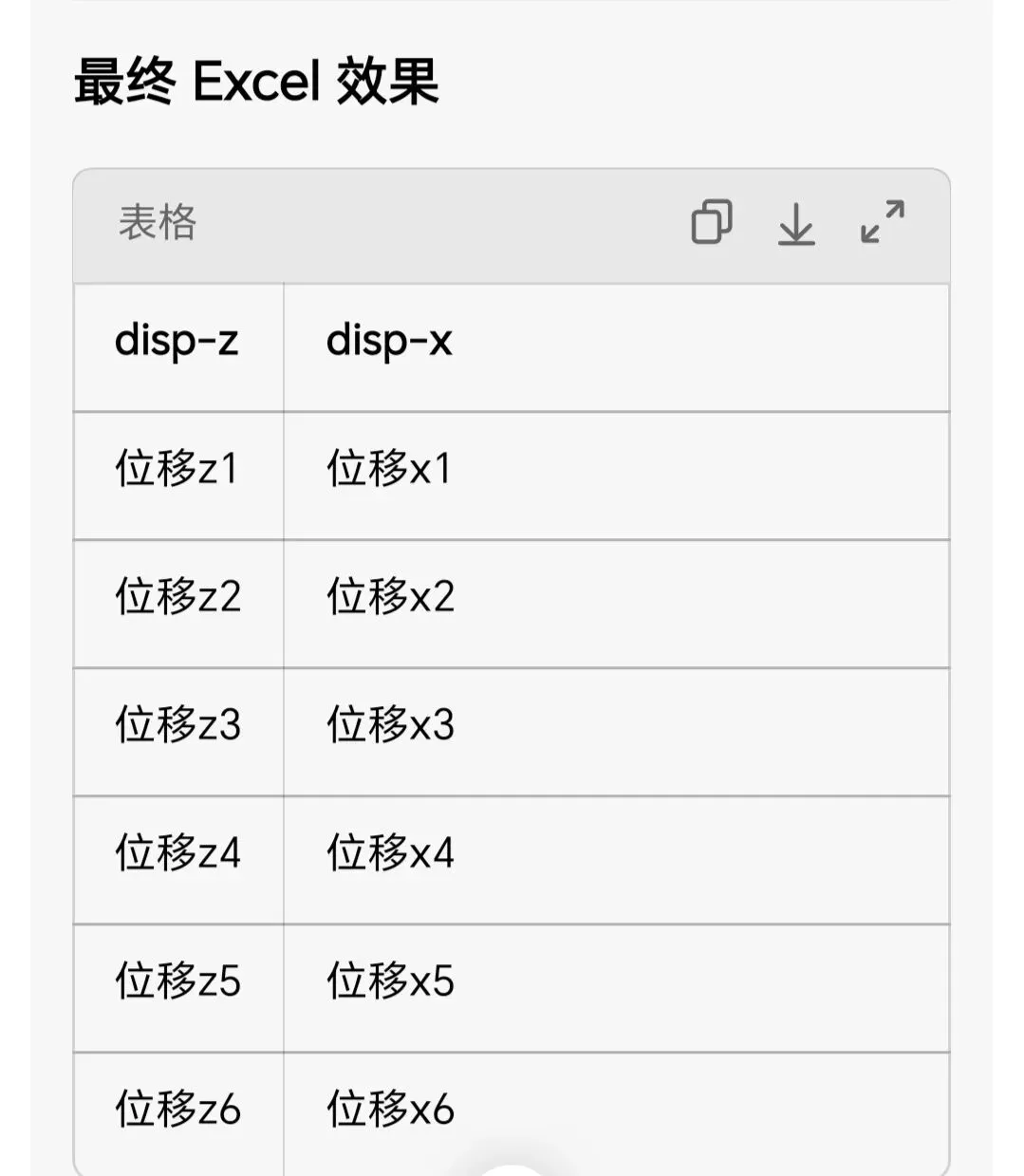 循环读取 6 个计算结果文件kw_1.f3sav~kw_6.f3sav→ 提取同一个点 (3,3,6) 的 X、Z 方向位移→ 自动保存成 Excel 表格 ceshi.xlsx