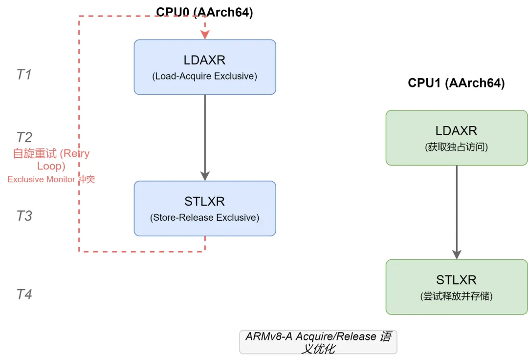 T3时刻:CPU0执行STREX,因独占标记已被清除,写回失败(tmp=1),触发bne指令重新跳回LDREX;