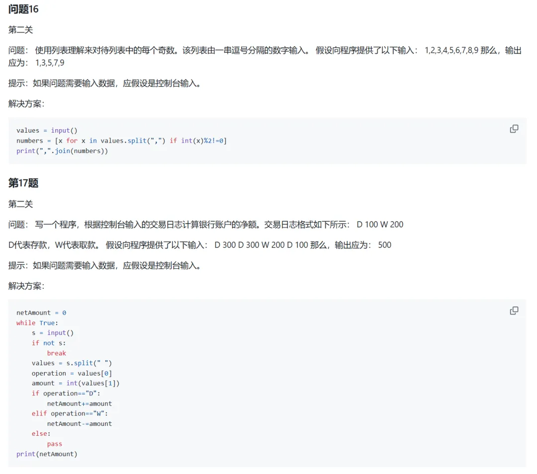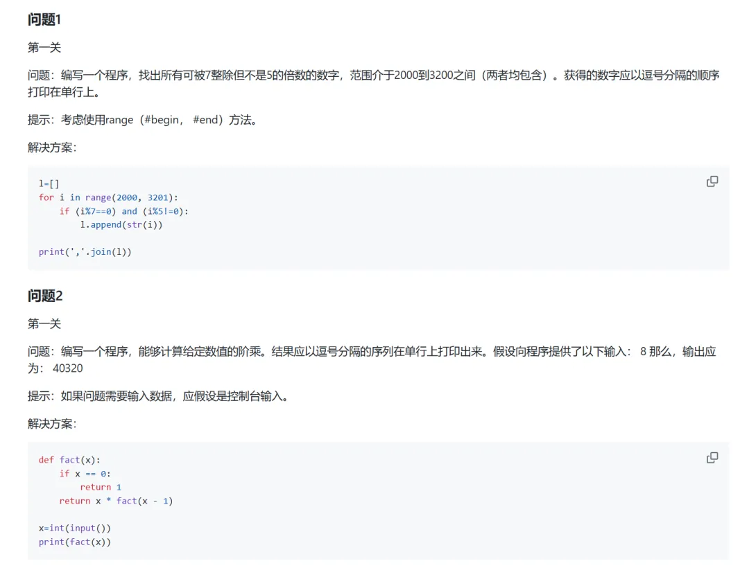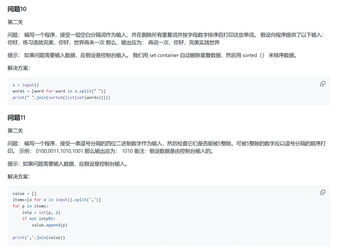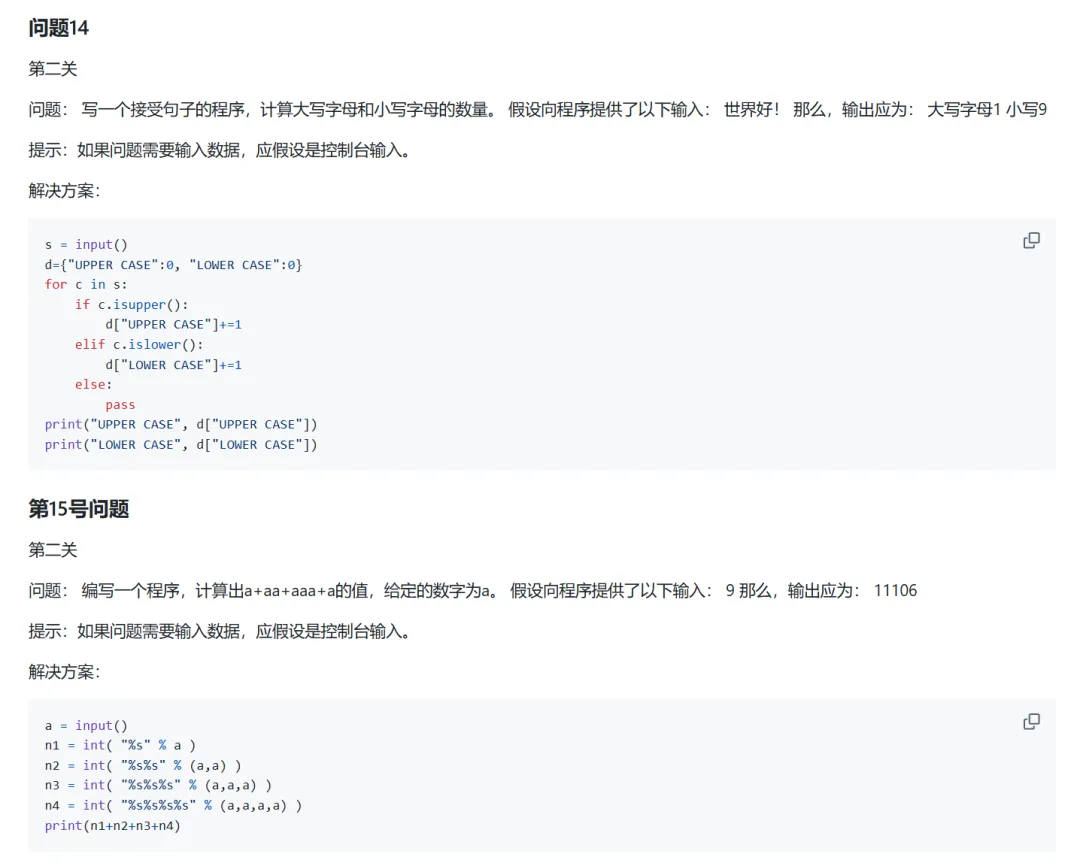 很多刚开始学习Python的同学,可能想要找一些编程题来练手,又不知道什么样的题目表示什么难度,以及适合什么水平的同学来练手这一期给大家推荐的Python编程练习项目,题目难度分为一级,二级和三级对于刚开始入门Python的同学来说,能完成一级题目即可;如果具有较强编程基础,那完成二级编程题目即可;如果是能够使用丰富的库,函数和数据结构与算法,解决更复杂的问题,练习三级题目即可下面具体来介绍一下zhiwehu开源的Python练习项目首先是range函数的用法,控制台数据输入练习,dict()的用法,tuple元组的使用,init方法构造一些参数,进制转换等然后介绍字符串分割,列表的用法,字符串转换为二进制,奇偶数处理,控制输出格式,字符串运算等还有关于检查密码,多规则排序,循环迭代,机器人移动,计算词频,计算数字平方值,内置函数,类的定义等内容内容很多,就不进行一一介绍了,大家可以根据自己的水平,选择相应的内容进行学习,总共100道题目,难度不同上面的资料做了一些整理,有需要的同学可以获取(仅供学习使用)2. 发送口令“Python练习项目”领取(人工回复可能有时差,都会发给大家的,不用着急)