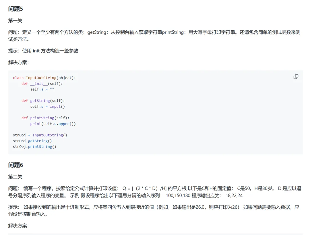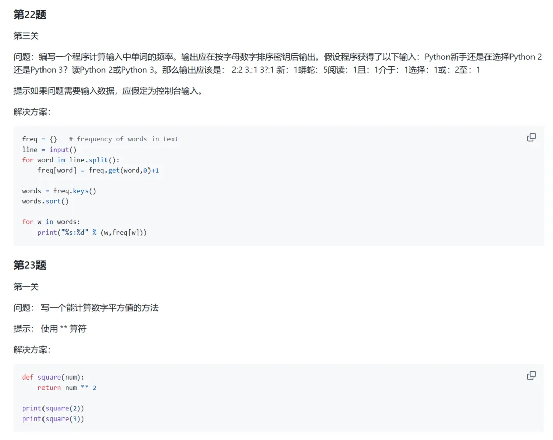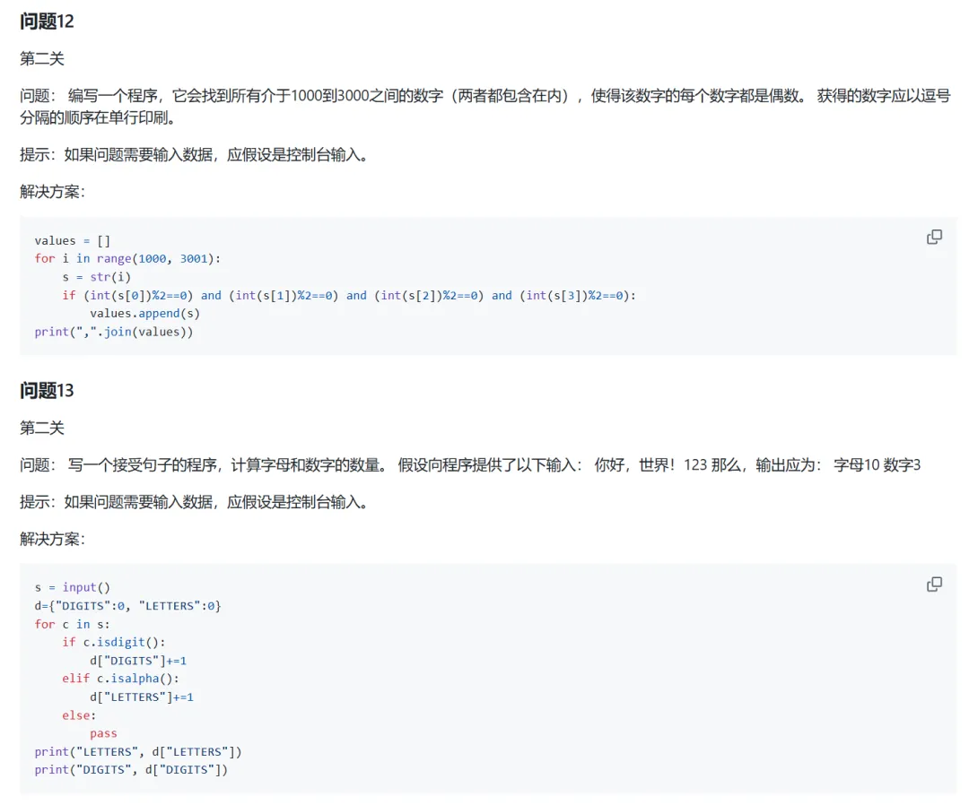 很多刚开始学习Python的同学,可能想要找一些编程题来练手,又不知道什么样的题目表示什么难度,以及适合什么水平的同学来练手这一期给大家推荐的Python编程练习项目,题目难度分为一级,二级和三级对于刚开始入门Python的同学来说,能完成一级题目即可;如果具有较强编程基础,那完成二级编程题目即可;如果是能够使用丰富的库,函数和数据结构与算法,解决更复杂的问题,练习三级题目即可下面具体来介绍一下zhiwehu开源的Python练习项目首先是range函数的用法,控制台数据输入练习,dict()的用法,tuple元组的使用,init方法构造一些参数,进制转换等然后介绍字符串分割,列表的用法,字符串转换为二进制,奇偶数处理,控制输出格式,字符串运算等还有关于检查密码,多规则排序,循环迭代,机器人移动,计算词频,计算数字平方值,内置函数,类的定义等内容内容很多,就不进行一一介绍了,大家可以根据自己的水平,选择相应的内容进行学习,总共100道题目,难度不同上面的资料做了一些整理,有需要的同学可以获取(仅供学习使用)2. 发送口令“Python练习项目”领取(人工回复可能有时差,都会发给大家的,不用着急)