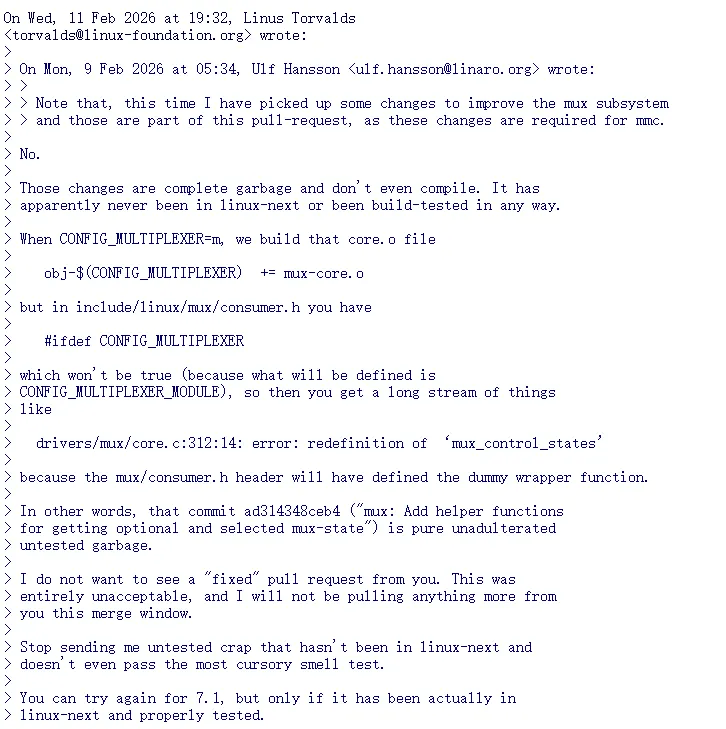 “不接受。 这些变更完全是垃圾,连编译都通不过。 看起来它根本没进过 linux-next,也没有任何人做过 build 测试。当 CONFIG_MULTIPLEXER=m 的时候,我们会编译 core.o 这个文件obj-$(CONFIG_MULTIPLEXER) += mux-core.o但在 include/linux/mux/consumer.h 里却写着#ifdef CONFIG_MULTIPLEXER这在模块情况下(CONFIG_MULTIPLEXER_MODULE 被定义)是不会成立的,于是就出现了一长串错误,比如drivers/mux/core.c:312:14: error: redefinition of ‘mux_control_states’因为 mux/consumer.h 头文件里定义了那些 dummy 包装函数。换句话说,ad314348ceb4 ("mux: Add helper functions for getting optional and selected mux-state") 这个 commit 就是纯粹的、未经测试的垃圾。我不想看到你发来什么“修复版”的 pull request。这完全不可接受,这个 merge window 我不会再从你这里拉任何东西了。别再给我发这种没进 linux-next、连最基本的闻一闻都臭烘烘的垃圾代码。等 7.1 的时候你可以再试,但前提是它真的进过 linux-next,并且经过了认真的测试。”因此,这些 MMC 相关的变更现在只能推迟到 Linux 7.1 的合并窗口了。 Linux 7.0 正式稳定版发布后,大约在四月中旬才会开启 7.1 的合并窗口。