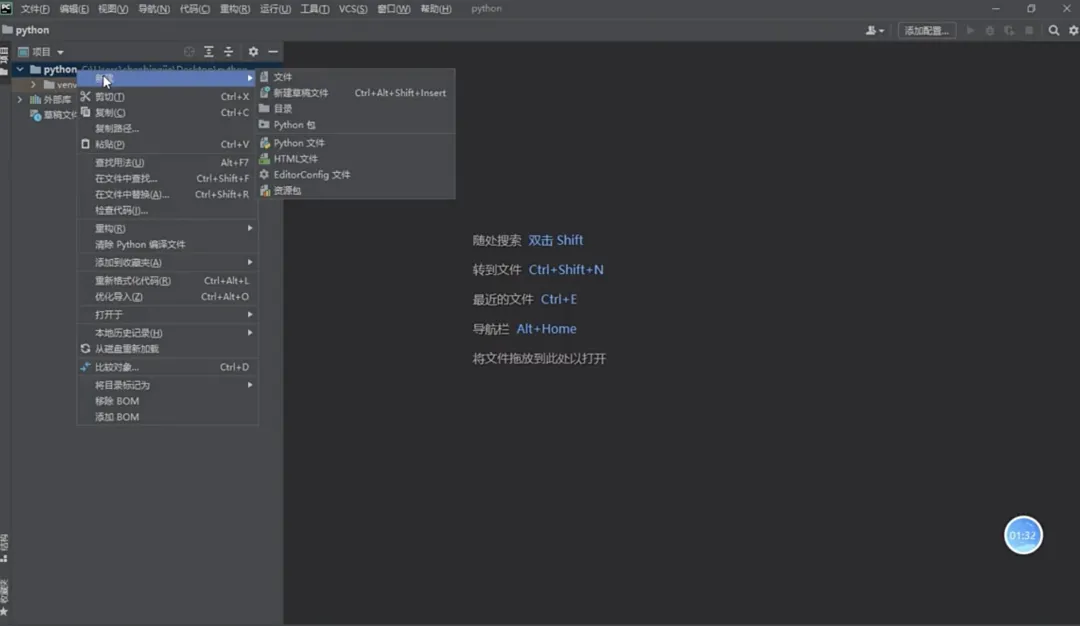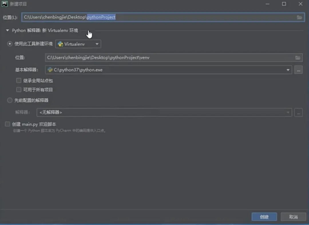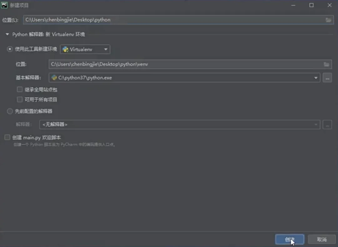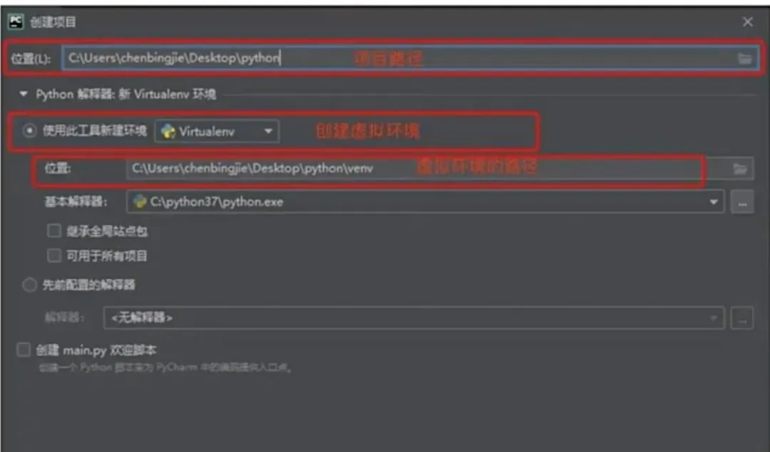 运行Pycharm,选择“新建项目”来创建一个新的项目。新建项目时,需指定项目的路径并创建运行项目的“虚拟环境”,如下图所示。