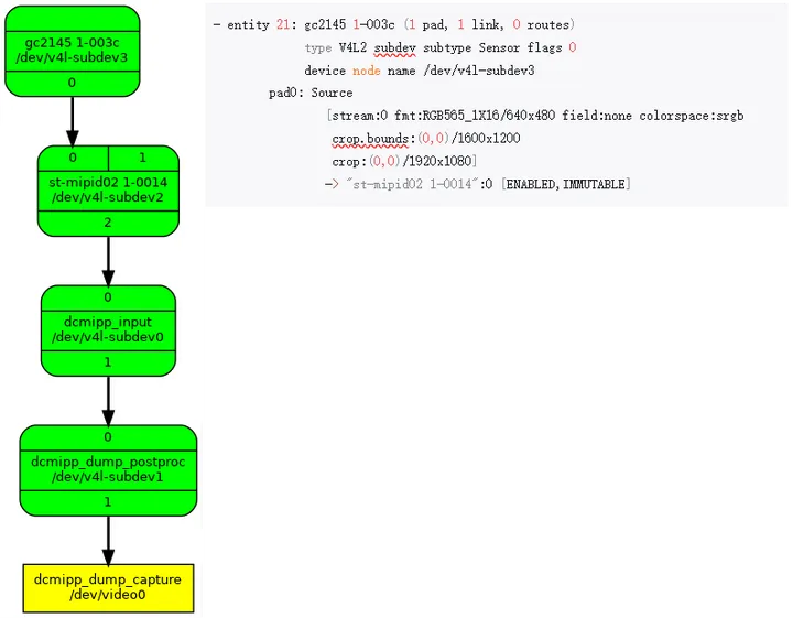 Media controller API version 6.6.48Media device information------------------------driver dcmippmodel DCMIPP MDEVserialbus info platform:5a000000.dcmipphw revision 0x10driver version 6.6.48Device topology- entity 1: dcmipp_input (2 pads, 2 links, 0 routes)type V4L2 subdev subtype Unknown flags 0device node name /dev/v4l-subdev0pad0: Sink[stream:0 fmt:RGB565_2X8_LE/640x480 field:none colorspace:srgb]<- "st-mipid02 1-0014":2 [ENABLED,IMMUTABLE]pad1: Source[stream:0 fmt:RGB565_2X8_LE/640x480 field:none colorspace:rec709]-> "dcmipp_dump_postproc":0 [ENABLED,IMMUTABLE]- entity 4: dcmipp_dump_postproc (2 pads, 2 links, 0 routes)type V4L2 subdev subtype Unknown flags 0device node name /dev/v4l-subdev1pad0: Sink[stream:0 fmt:RGB565_2X8_LE/640x480 field:none colorspace:rec709compose.bounds:(0,0)/640x480compose:(0,0)/640x480]<- "dcmipp_input":1 [ENABLED,IMMUTABLE]pad1: Source[stream:0 fmt:RGB565_2X8_LE/640x480 field:none colorspace:rec709crop.bounds:(0,0)/640x480crop:(0,0)/640x480]-> "dcmipp_dump_capture":0 [ENABLED,IMMUTABLE]- entity 7: dcmipp_dump_capture (1 pad, 1 link)type Node subtype V4L flags 0device node name /dev/video0pad0: Sink<- "dcmipp_dump_postproc":1 [ENABLED,IMMUTABLE]- entity 15: st-mipid02 1-0014 (3 pads, 2 links, 0 routes)type V4L2 subdev subtype Unknown flags 0device node name /dev/v4l-subdev2pad0: Sink[stream:0 fmt:RGB565_1X16/640x480 field:none colorspace:srgb]<- "gc2145 1-003c":0 [ENABLED,IMMUTABLE]pad1: Sinkpad2: Source[stream:0 fmt:RGB565_2X8_LE/640x480 field:none colorspace:srgb]-> "dcmipp_input":0 [ENABLED,IMMUTABLE]- entity 21: gc2145 1-003c (1 pad, 1 link, 0 routes)type V4L2 subdev subtype Sensor flags 0device node name /dev/v4l-subdev3pad0: Source[stream:0 fmt:RGB565_1X16/640x480 field:none colorspace:srgbcrop.bounds:(0,0)/1600x1200crop:(0,0)/1920x1080]-> "st-mipid02 1-0014":0 [ENABLED,IMMUTABLE]