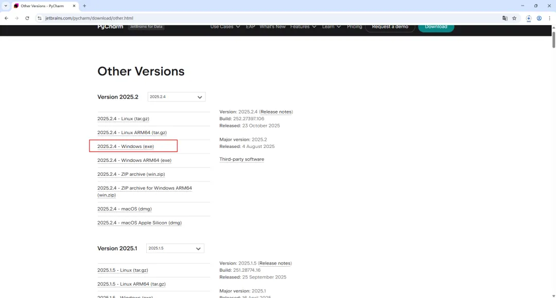 这里演示用的版本为2025.2.4-Windows(exe),所以下面下载的是2025.2.4-Windows(exe)这个版本(可以往下滑,选择下载不一样的版本,不过可能界面跟我演示用的版本界面不太一样)