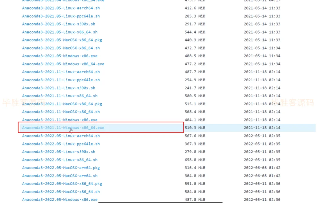我的系统为windows系统,这里选择 Anaconda3-2021.11-Windows-x86_64.exe,也可以选择其他的版本