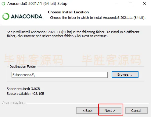 我安装在 E:\anaconda3\ 目录下(要记得这个位置,后面会用到),然后点击 Next