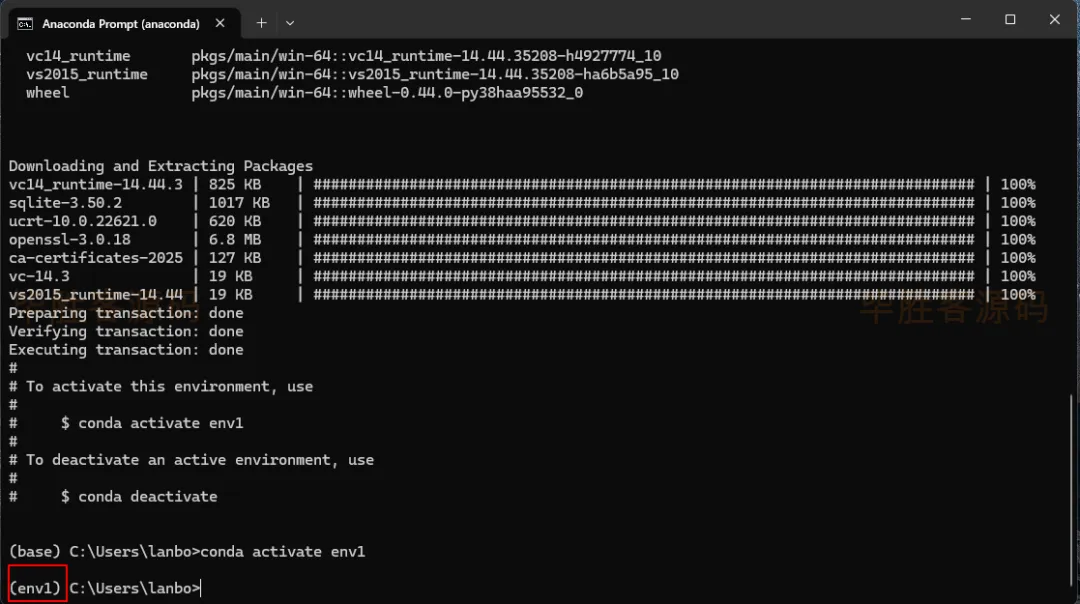 (2)虚拟环境创建成功后,输入命令 conda activate env1 后按下回车键进入到此虚拟环境(即 激活虚拟环境)