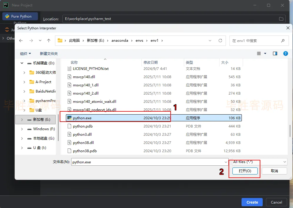 (6)在弹出的文件夹中进入到安装anaconda的文件夹(我安装在E盘的anaconda文件夹中,这个位置在安装anaconda时就需要记住),进入到envs的env1中,其中env1是上面我们建的虚拟环境的名称(如果你建的虚拟环境不是这个名称,那就是其他的名称),进到env1后选择python.exe,然后点击 打开