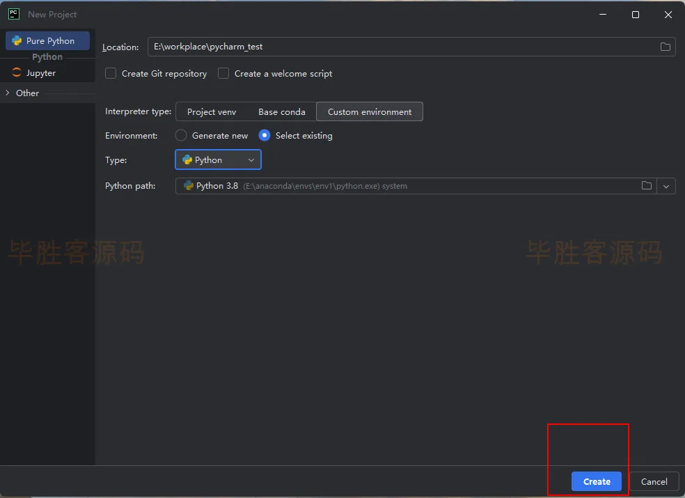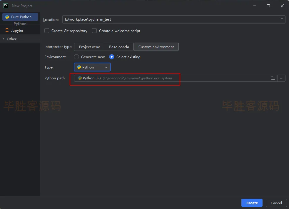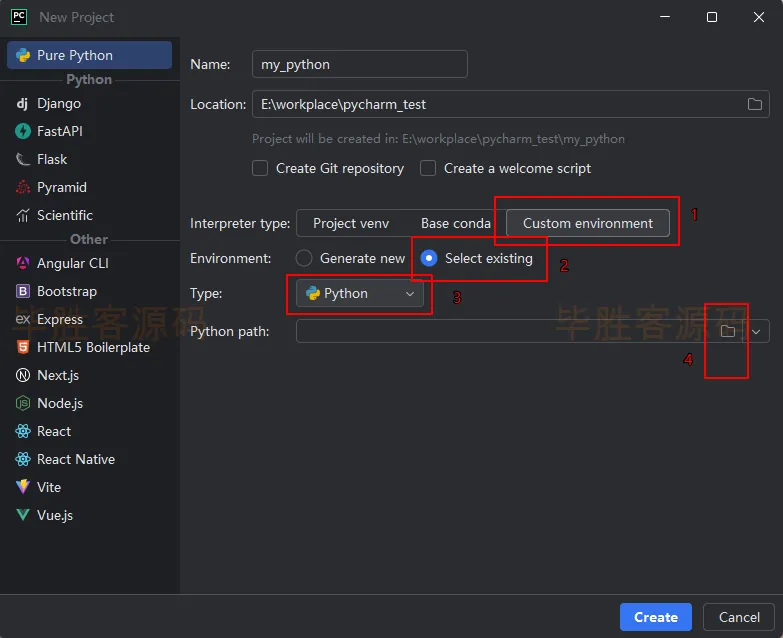 (5)依次点击 Custom environment -- Select existing -- Python,最后点击右边的文件夹图标