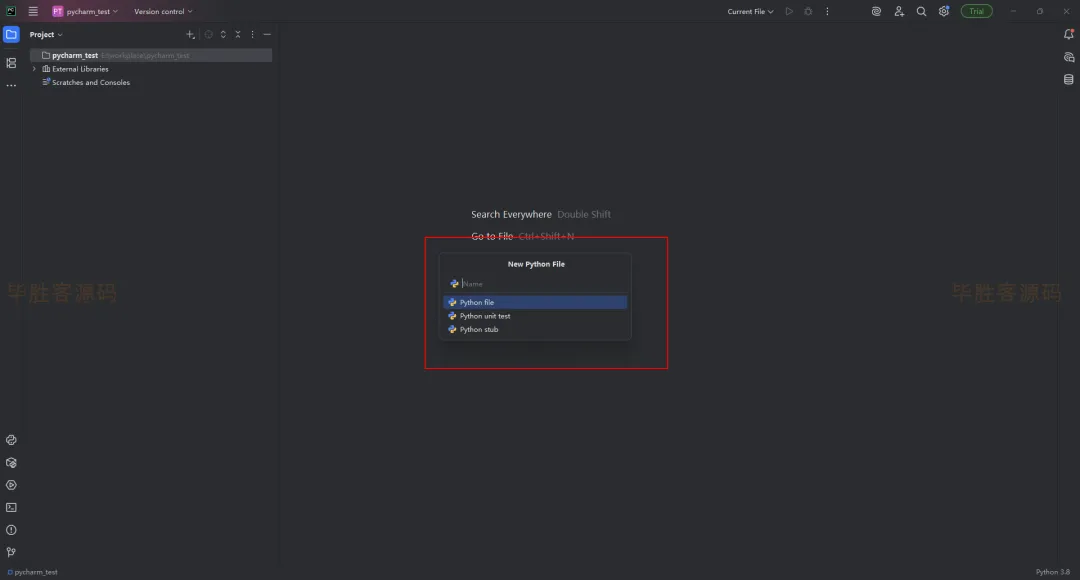 (10)现在新建一个python程序文件,演示效果。鼠标放到pycharm左上角的pycharm_test (这是我的python项目名称,你的可能是其他的名称),鼠标右键 -- New -- Python File