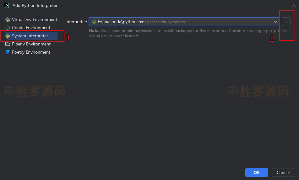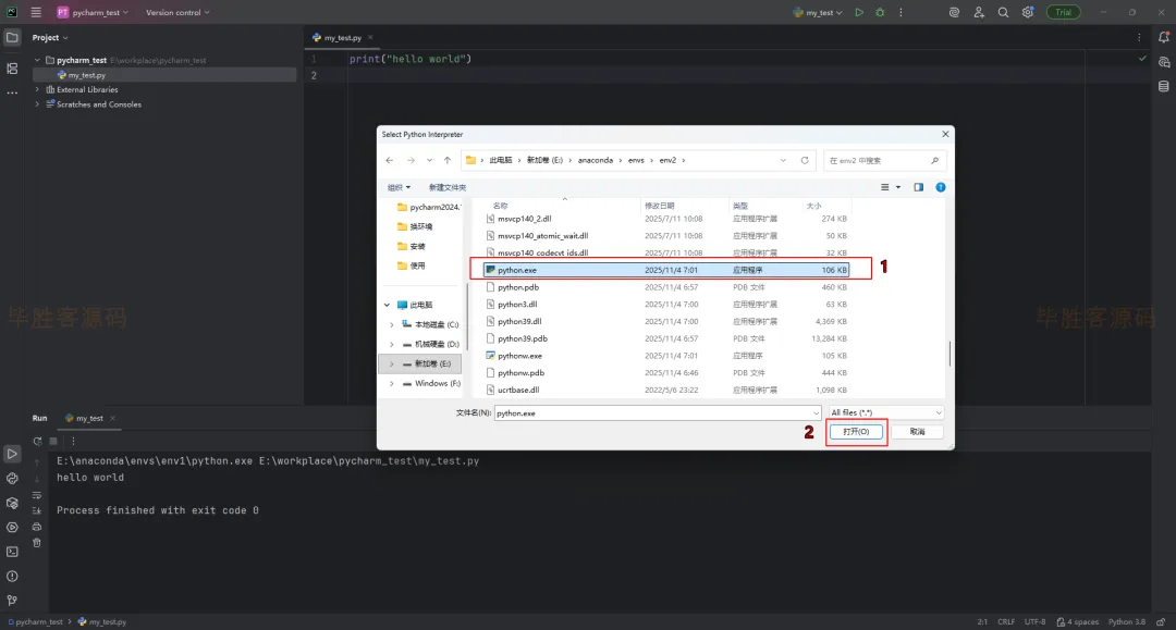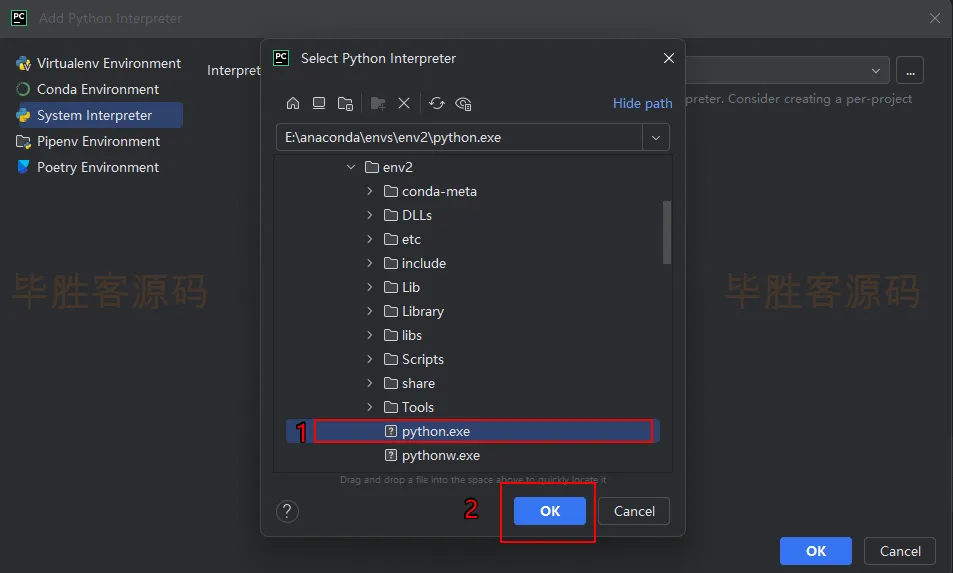 (4)在弹出的窗口里找到安装anaconda的位置(我安装在E盘的anaconda文件夹中,这个位置在安装anaconda时就需要记住),进入到envs的env2中,其中env2是我们上面建的虚拟环境的名称(如果你建的虚拟环境不是这个名称,那就是其他的名称),进到env2后选择python.exe,然后点击 OK