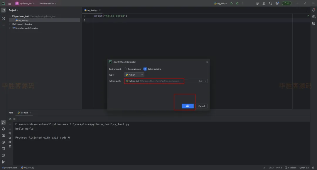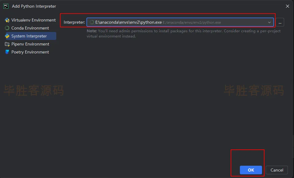 (5)可以看到python的路径是虚拟环境 env2 里面的 python ,然后点击 OK