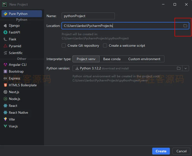 (3)点击右边的文件夹图标,这是指定python项目路径和项目名称的