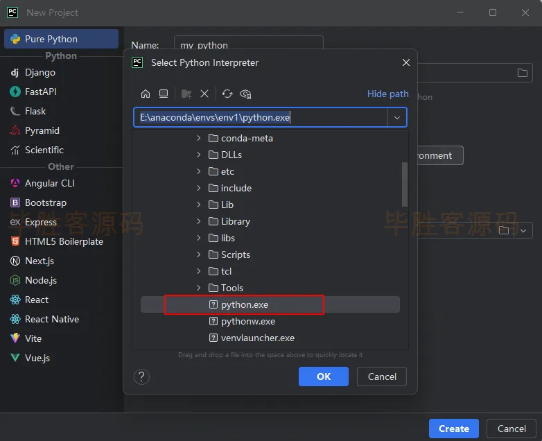 (5)在弹出的窗口里找到安装anaconda的位置(我安装在E盘的anaconda文件夹中,这个位置在安装anaconda时就需要记住),进入到envs的env1中,其中env1是我们上面建的虚拟环境的名称(如果你建的虚拟环境不是这个名称,那就是其他的名称),进到env1后选择python.exe,然后点击 OK