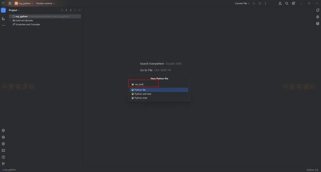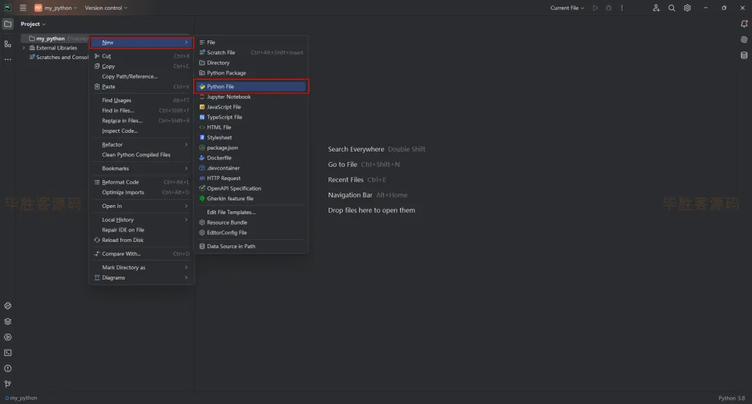 (9)现在创建一个python程序验证这个环境是否有效。鼠标放到pycharm左上角的 my_python (你的可能是其他名称),鼠标右键 -- New -- Python File