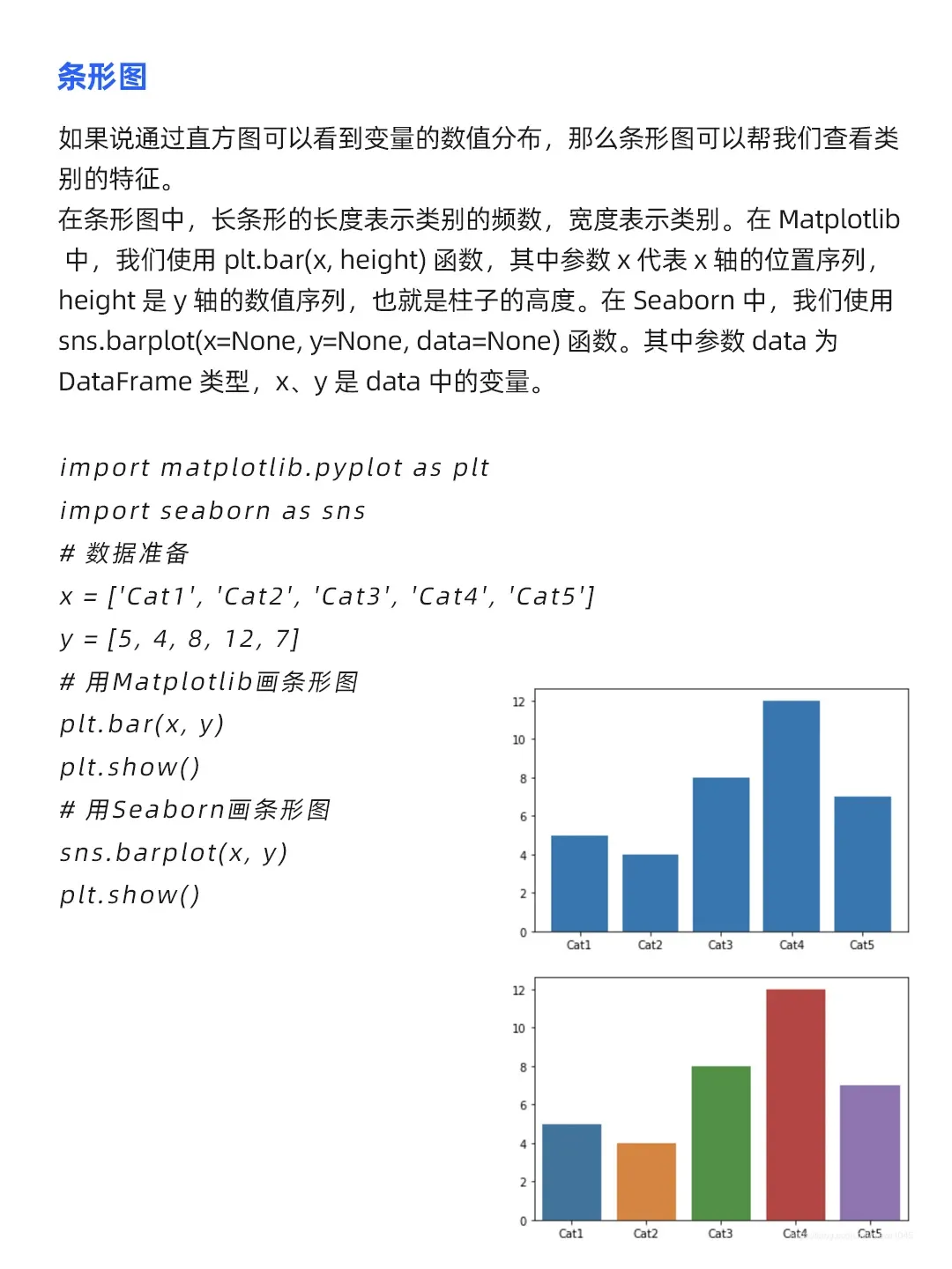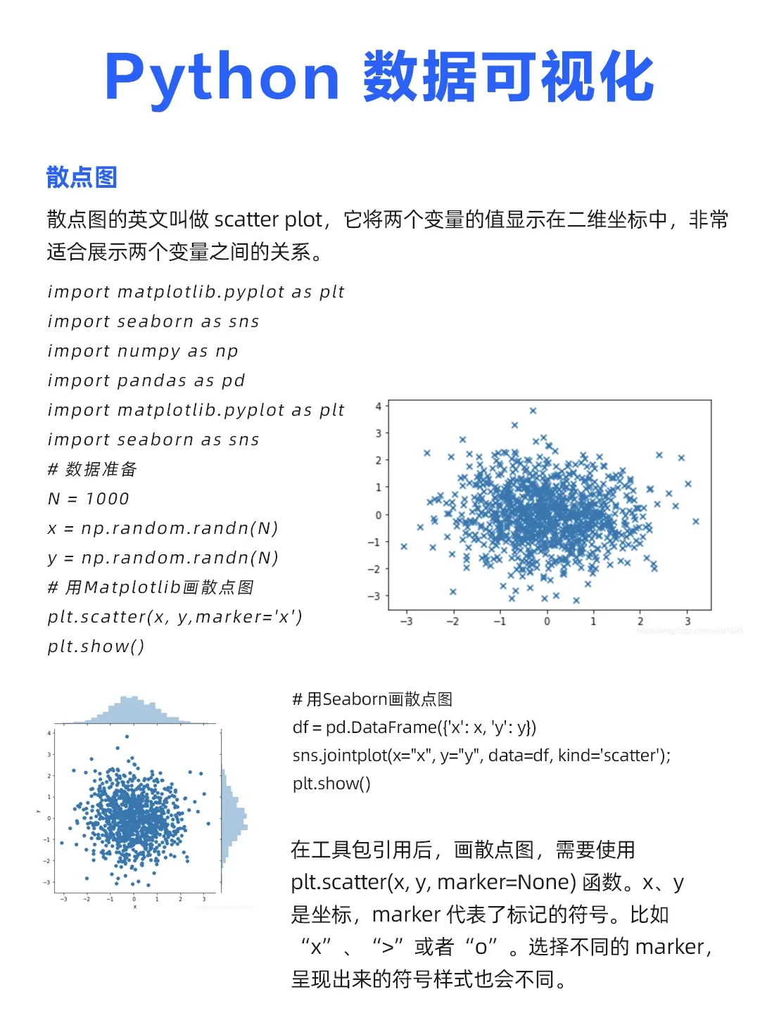 散点图、折线图、直方图、条形图、箱线图、饼图、热力图、蜘蛛图、二元变量分布和成对关系