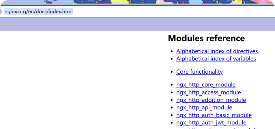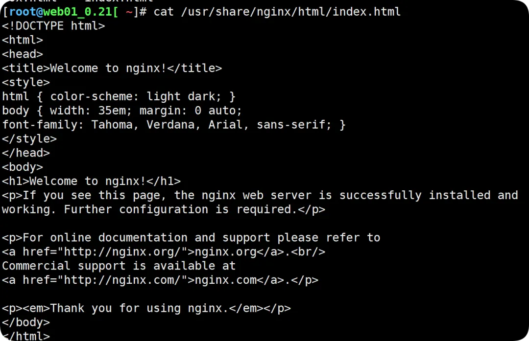 //可使用rpm -ql nginx查看软件整体目录结构[root@web01_0.21[ ~] rpm -ql nginx/etc/logrotate.d/nginx/etc/nginx //安装目录路径/etc/nginx/conf.d/etc/nginx/conf.d/default.conf //默认的站点/etc/nginx/fastcgi_params //通过模块链接php,传递的变量/etc/nginx/mime.types //支持的文件类型,回传浏览器/etc/nginx/modules //模块,缺省值是空;/etc/nginx/nginx.conf //重点掌握,主配置文件/etc/nginx/scgi_params //调用py,内容是变量/etc/nginx/uwsgi_params/usr/lib/systemd/system/nginx-debug.service ///usr/lib/systemd/system/nginx.service //服务的启动与停止文件/usr/lib64/nginx ///usr/lib64/nginx/modules/usr/libexec/initscripts/legacy-actions/nginx/usr/libexec/initscripts/legacy-actions/nginx/check-reload/usr/libexec/initscripts/legacy-actions/nginx/upgrade/usr/sbin/nginx //二进制文件,Nginx的命令/usr/sbin/nginx-debug/usr/share/doc/nginx-1.26.1/usr/share/doc/nginx-1.26.1/COPYRIGHT/usr/share/man/man8/nginx.8.gz/usr/share/nginx //默认的站点路径可以更改/usr/share/nginx/html/usr/share/nginx/html/50x.html/usr/share/nginx/html/index.html/var/cache/nginx //缓存目录/var/log/nginx //日志文件路径如图所示:默认站点的页面内容就在此路径下,并且可以删掉新建自己写好的内容,减轻了主配置文件的臃肿;