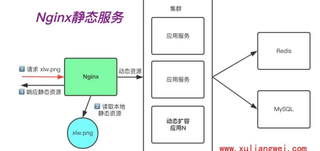 在很多时候我们访问 docs、pdf、mp4、png 等这样的静 态资源时,是没有必要将这些请求通过 Nginx 交给后端 的应用服务,我们只需要通过 Nginx 直接处理“静态资源” 即可。这是 Nginx 的静态资源功能。