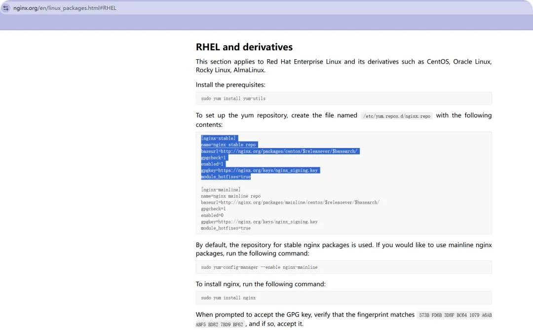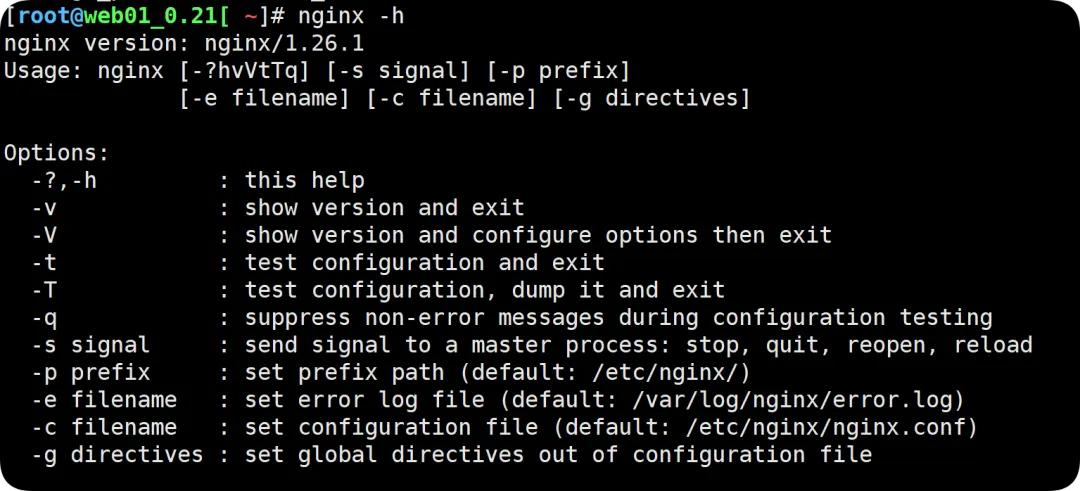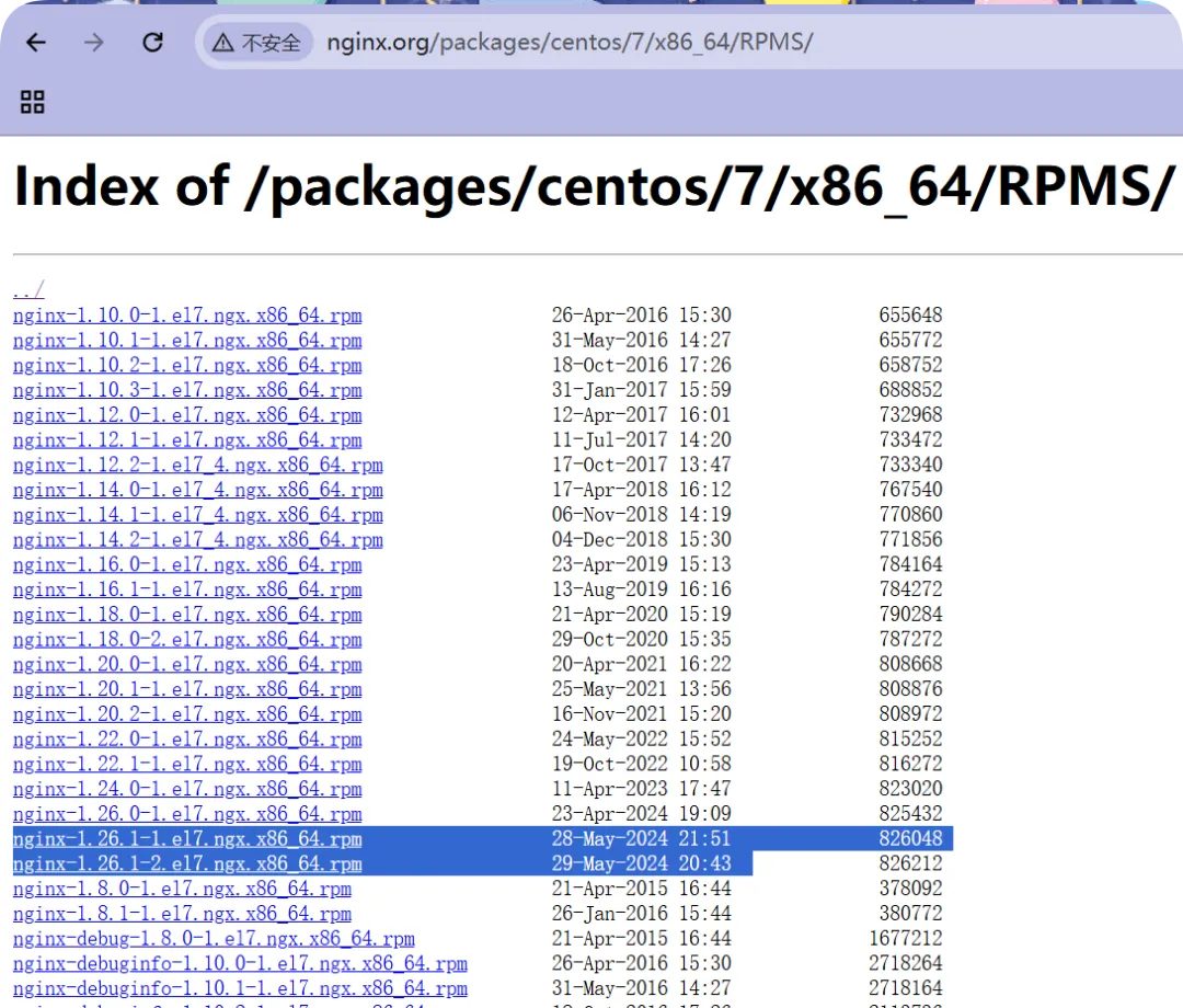 //设置yum 仓库,请创建名为 /etc/yum.repos.d/nginx.repo 的文件,并将以下内容添加到该文件中://Nginx官方源的文件内容,这里的文件名可以随意,只不过为了更清楚目的而已;[root@web01_0.21[ /]# cat /etc/yum.repos.d/nginx.repo[nginx-stable]name=nginx stable repobaseurl=http://nginx.org/packages/centos/$releasever/$basearch/gpgcheck=1enabled=1gpgkey=https://nginx.org/keys/nginx_signing.keymodule_hotfixes=true//更新yum源缓存[root@web01_0.21[ /]# yum makecache//清理yum缓存[root@web01_0.21[ /]# yum clean all// 暂不要+y,看下是否从Nginx官方下载[root@web01_0.21[ /] yum install nginx已加载插件:fastestmirrorLoading mirror speeds from cached hostfile * base: mirrors.aliyun.com * extras: mirrors.aliyun.com * updates: mirrors.aliyun.com正在解决依赖关系--> 正在检查事务---> 软件包 nginx.x86_64.1.1.26.1-2.el7.ngx 将被 安装--> 正在处理依赖关系 libpcre2-8.so.0()(64bit),它被软件包 1:nginx-1.26.1-2.el7.ngx.x86_64 需要--> 正在检查事务---> 软件包 pcre2.x86_64.0.10.23-2.el7 将被 安装--> 解决依赖关系完成依赖关系解决=================================================================================================================================================================================================================================================== Package 架构 版本 源 大小===================================================================================================================================================================================================================================================正在安装: nginx x86_64 1:1.26.1-2.el7.ngx //看到了安装版本为1.26 nginx-stable //正常 807 k为依赖而安装: pcre2 x86_64 10.23-2.el7 base 201 k事务概要===================================================================================================================================================================================================================================================安装 1 软件包 (+1 依赖软件包)总下载量:1.0 M安装大小:3.4 MIs this ok [y/d/N]: //查看yum源无误和最新版本后,执行覆盖安装已安装: nginx.x86_64 1:1.26.1-2.el7.ngx作为依赖被安装: pcre2.x86_64 0:10.23-2.el7完毕!