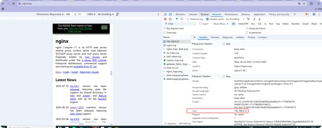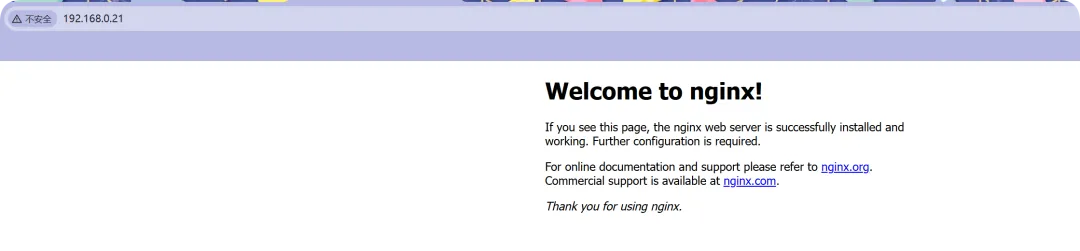 //修改禁止访问IP访问的配置文件,强制跳转到nginx网站[root@web01_0.21[ /etc/nginx/conf.d] vim localhots.confserver { listen 80 default_server;return 302 https://nginx.org;}[root@web01_0.21[ /etc/nginx/conf.d]# nginx -tnginx: the configuration file /etc/nginx/nginx.conf syntax is oknginx: configuration file /etc/nginx/nginx.conf test is successful[root@web01_0.21[ /etc/nginx/conf.d]# systemctl reload nginx