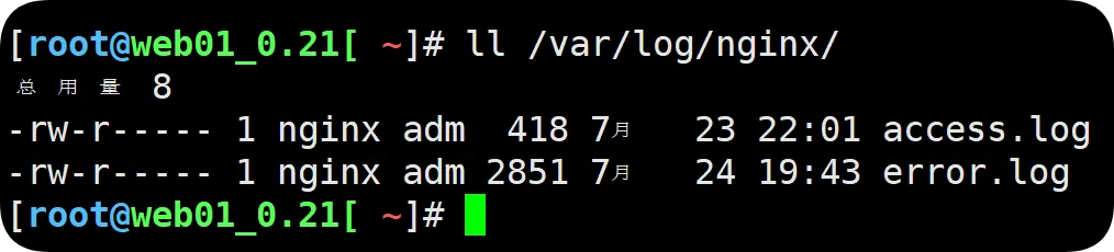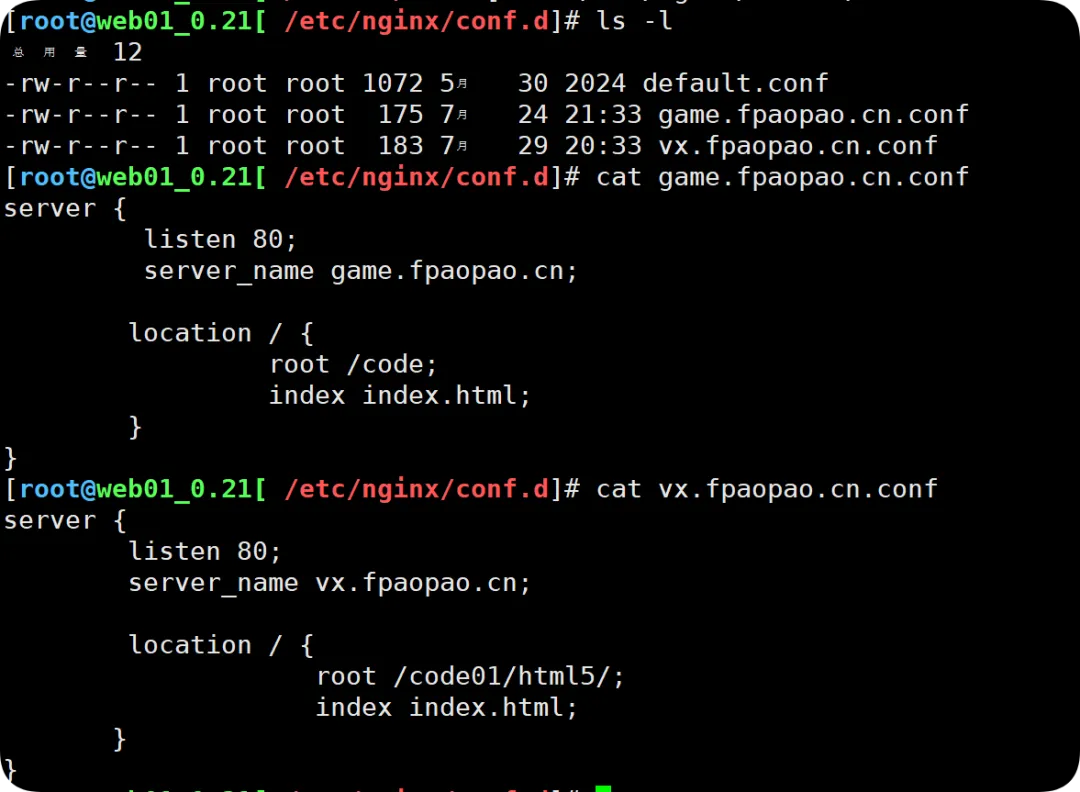 //将某个配置文件上移[root@web01_0.21[ /etc/nginx/conf.d] mv game.fpaopao.cn.conf agame.fpaopao.cn.conf[root@web01_0.21[ /etc/nginx/conf.d]# ls -l总用量 12-rw-r--r-- 1 root root 175 7月 24 21:33 agame.fpaopao.cn.conf //最前面-rw-r--r-- 1 root root 1072 5月 30 2024 default.conf-rw-r--r-- 1 root root 183 7月 29 20:33 vx.fpaopao.cn.conf[root@web01_0.21[ /etc/nginx/conf.d]# systemctl reload nginx //平滑重启