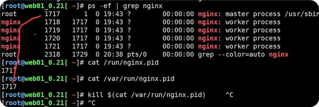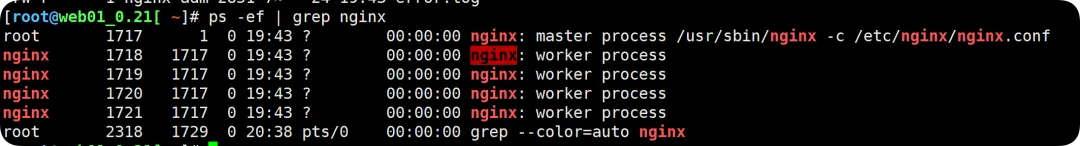 //开机自启动并启动Nginx服务[root@web01_0.21[ /]# systemctl enable nginxCreated symlink from /etc/systemd/system/multi-user.target.wants/nginx.service to /usr/lib/systemd/system/nginx.service.[root@web01_0.21[ /]# systemctl start nginx//查看nginx端口和进程[root@web01_0.21[ /]# netstat -lntup | grep nginxtcp 0 0 0.0.0.0:80 0.0.0.0:* LISTEN 2035/nginx: master[root@web01_0.21[ /]# ps -ef | grep nginxroot 2035 1 0 21:59 ? 00:00:00 nginx: master process /usr/sbin/nginx -c /etc/nginx/nginx.confnginx 2036 2035 0 21:59 ? 00:00:00 nginx: worker processnginx 2037 2035 0 21:59 ? 00:00:00 nginx: worker processnginx 2038 2035 0 21:59 ? 00:00:00 nginx: worker processnginx 2039 2035 0 21:59 ? 00:00:00 nginx: worker processroot 2048 1724 0 22:00 pts/0 00:00:00 grep --color=auto nginx[root@web01_0.21[ /]#