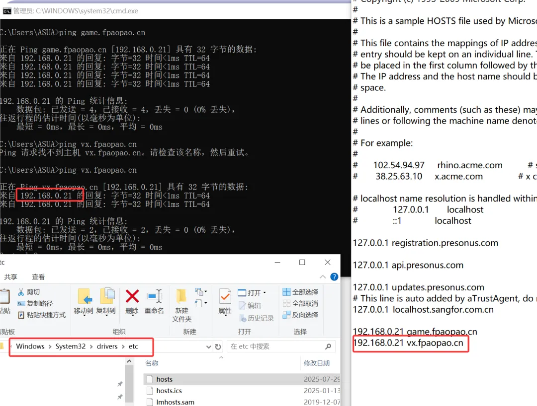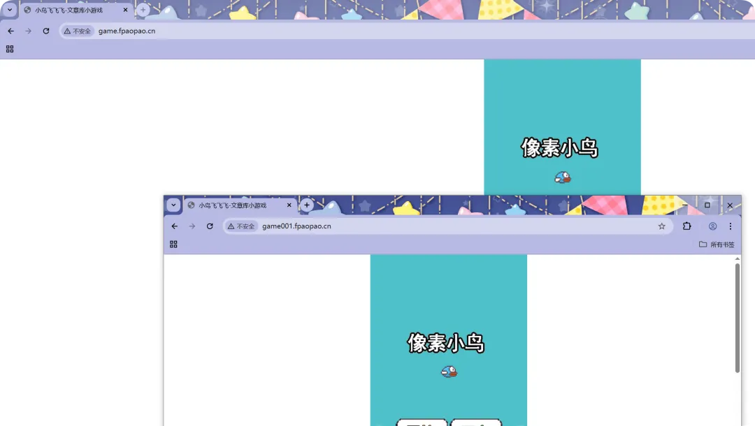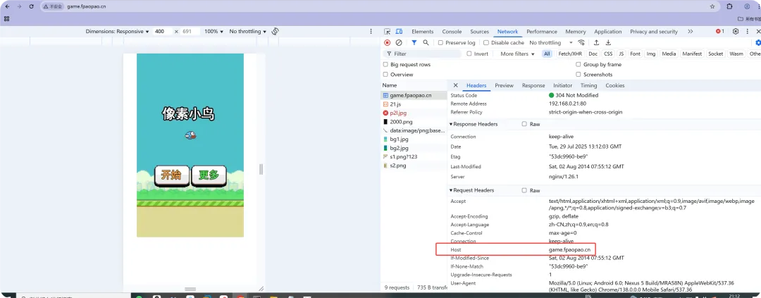 //修改hosts文件,类似DNS劫持C:\Windows\System32\drivers\etc --->hosts192.168.0.21 game001.fpaopao.cn//创建另外一个站点名录 (和game.fpaopao.cn站点内容保持一致)[root@web01_0.21[ /tools]# mkdir /game001[root@web01_0.21[ /tools]# cp xiaoniaofeifei.zip /game001///解压源码文件root@web01_0.21[ /tools]# cd /game001/[root@web01_0.21[ /game001]# ls -l总用量 92-rw-r--r-- 1 root root 91014 7月 31 20:28 xiaoniaofeifei.zip[root@web01_0.21[ /game001]# unzip xiaoniaofeifei.zip Archive: xiaoniaofeifei.zip inflating: sound1.mp3 creating: img/ inflating: img/bg1.jpg inflating: img/bg2.jpg inflating: img/number1.png inflating: img/number2.png inflating: img/s1.png inflating: img/s2.png inflating: 21.js inflating: 2000.png inflating: icon.png inflating: index.html //创建另外一个域名站点[root@web01_0.21[ /etc/nginx/conf.d]# cat /etc/nginx/conf.d/game001.fpaopao.cn.conf server { listen 80; server_name game001.fpaopao.cn; location / { root /game001; index index.html; }}//重启并加载[root@web01_0.21[ /etc/nginx/conf.d]# nginx -tnginx: the configuration file /etc/nginx/nginx.conf syntax is oknginx: configuration file /etc/nginx/nginx.conf test is successful[root@web01_0.21[ /etc/nginx/conf.d]# systemctl reload nginx