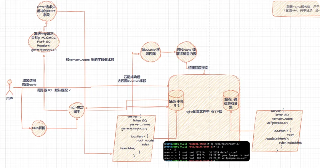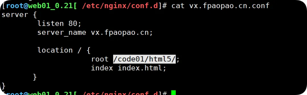 //在不修改配置文件名的前提下,让vx.fpaopao.cn这个站点优先返回默认页面[root@web01_0.21[ ~]# cd /etc/nginx/conf.d/[root@web01_0.21[ /etc/nginx/conf.d]# ls -l总用量 12-rw-r--r-- 1 root root 175 7月 24 21:33 agame.fpaopao.cn.conf-rw-r--r-- 1 root root 1072 5月 30 2024 default.conf-rw-r--r-- 1 root root 183 7月 29 20:33 vx.fpaopao.cn.conf[root@web01_0.21[ /etc/nginx/conf.d]# cat vx.fpaopao.cn.confserver { listen 80 default_server; //在这里面加入default_server内容 server_name vx.fpaopao.cn; location / { root /code01/html5/; index index.html; }}//检查语法重载[root@web01_0.21[ /etc/nginx/conf.d] nginx -tnginx: the configuration file /etc/nginx/nginx.conf syntax is oknginx: configuration file /etc/nginx/nginx.conf test is successful[root@web01_0.21[ /etc/nginx/conf.d] systemctl reload nginx