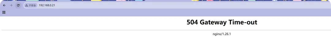 //将之前的vx.fpaopao.cn里配置文件的default_server字段中删掉,不明确指定//新建一个站点配置文件[root@web01_0.21[ /etc/nginx/conf.d]# cat localhots.confserver { listen 80 default_server;return 504; //这状态吗可以肆意写}//检查语法,平滑重启[root@web01_0.21[ /etc/nginx/conf.d]# nginx -tnginx: the configuration file /etc/nginx/nginx.conf syntax is oknginx: configuration file /etc/nginx/nginx.conf test is successful[root@web01_0.21[ /etc/nginx/conf.d]# systemctl reload nginx