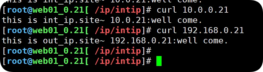 //基于主机多IP配置[root@web01_0.21[ /etc/nginx/conf.d]# cd /[root@web01_0.21[ /] mkdir -p /ip/outip //创建站点文件路径[root@web01_0.21[ /]# cd /ip/outip/ //外网IP站点路径[root@web01_0.21[ /ip/outip] echo"this is out_ip.site~ 192.168.0.21:well come." >index.html[root@web01_0.21[ /ip/outip]# cat /etc/nginx/conf.d/out_ip.conf //外网IP站点配置文件server { listen 192.168.0.21:80; location { root /ip/outip; index index.html; }}[root@web01_0.21[ /ip]# pwd/ip[root@web01_0.21[ /ip]# mkdir intip //创建内网IP站点路径[root@web01_0.21[ /etc/nginx/conf.d]# cat int_ip.conf //创建内网IP站点配置文件server { listen 10.0.0.21:80; location / { root /ip/intip; index index.html; }}//检查语法并重载[root@web01_0.21[ /ip/intip]# nginx -tnginx: the configuration file /etc/nginx/nginx.conf syntax is oknginx: configuration file /etc/nginx/nginx.conf test is successful[root@web01_0.21[ /ip/intip]# systemctl reload nginx不同IP捆绑在不同的主机之中;