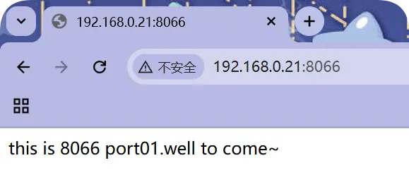//创建多端口站点目录[root@web01_0.21[ /]# mkdir -p /server/port01//编写对应的测试页[root@web01_0.21[ /]# cd /server/port01/[root@web01_0.21[ /server/port01]# echo "this is 8066 port01.well to come~" >index.html//创建虚拟主机多站点配置文件[root@web01_0.21[ /]# cat /etc/nginx/conf.d/port01.conf server { listen 8066; location / { root /server/port01; index index.html; }}//检查语法并重载[root@web01_0.21[ /ip/intip]# nginx -tnginx: the configuration file /etc/nginx/nginx.conf syntax is oknginx: configuration file /etc/nginx/nginx.conf test is successful[root@web01_0.21[ /ip/intip]# systemctl reload nginx