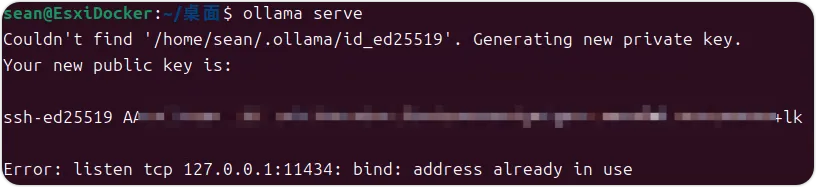 因为我是在esxi里面的虚拟机中做的这个文章的演示,且我没有开启显卡直通,所以这里安装完成后会有告警信息,说没有找到GPU,将使用CPU模式运行。启动 Ollama:在终端运行命令 ollama serve 启动 Ollama 服务。启动过程中会创建一个公钥和私钥并监听本地的11434端口。DeepSeek 部署