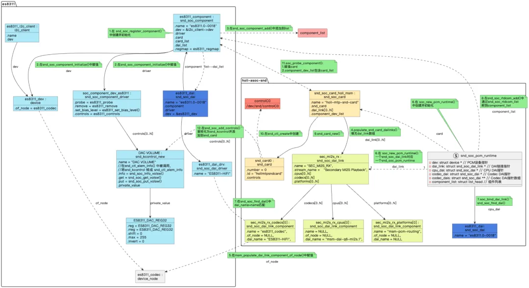 snd_soc_component_initialize() 里将关系图中的es8311_dev和soc_component_dev_es8311赋值给es8311_component。 - • 在